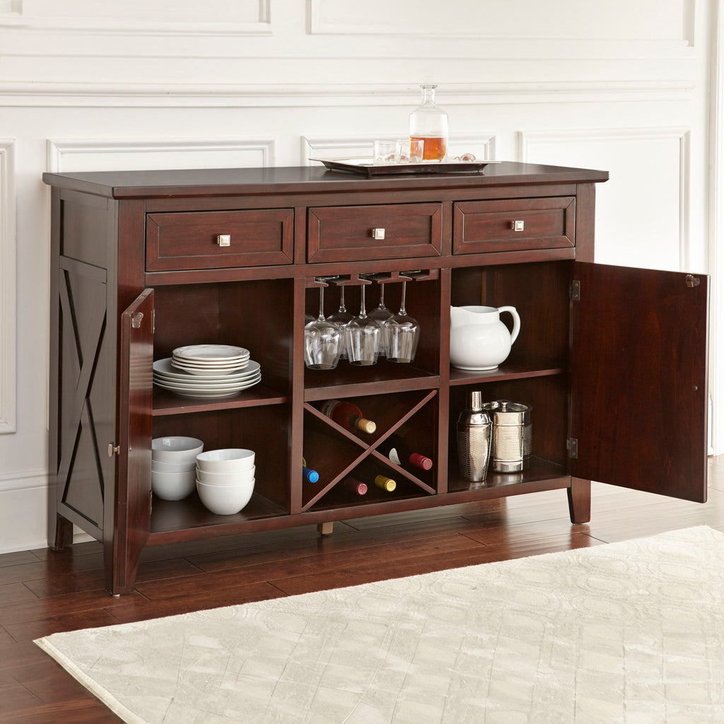 The look of the Adrian Server is unique and modern. The server is crafted of hardwood solids and primavera veneers, and boasts a hand applied espresso cherry finish. Features include 3 drawers, two cabinets with a shelf and stemware storage plus a removable wine rack. The perfect piece for your entertaining needs.