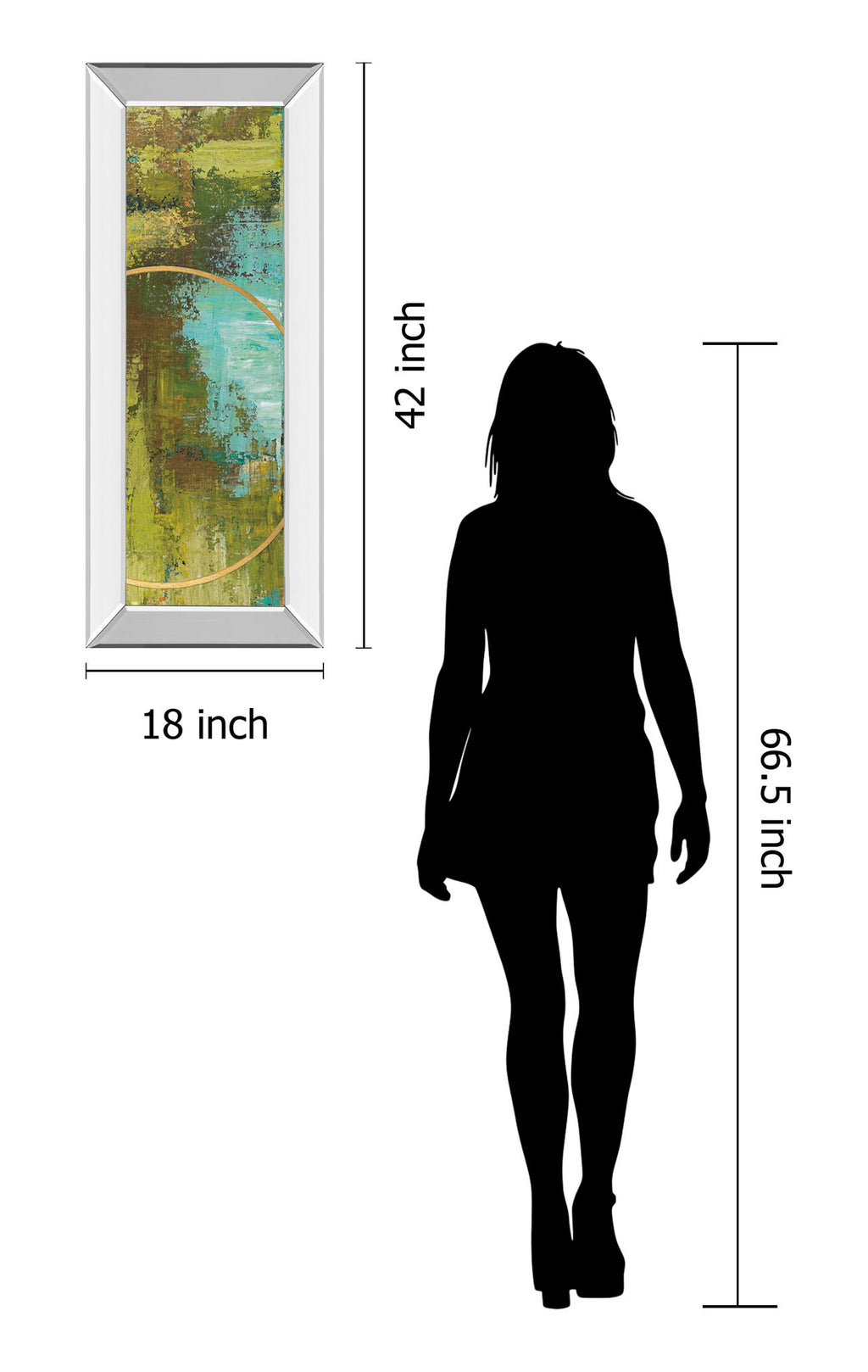 Step into a world where nature's vibrant palette meets modern abstraction with this captivating framed wall art. The piece features rich chartreuse, teal, and earthy brown tones, skillfully layered to create a textured landscape that invites contemplation. A subtle golden arc sweeps gracefully across the composition, adding elegance and fluidity to the design. Encased in a sleek mirrored frame, it reflects ambient light, enhancing the vivid colors and intricate details. Perfectly sized for vertical display, this artwork brings a fresh, sophisticated energy to living rooms or offices, effortlessly blending contemporary style with timeless charm.