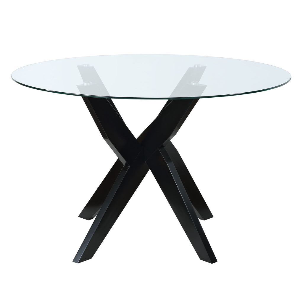 The Amalie Dining Table offers modern, casual dining in a compact shape. Styling details include the contemporary architectural pedestal base in a black finish with a spacious 48" round tempered glass top. The table can seat six comfortably while it's round shape gives the table a cozy, conversational feel. Your purchase includes one glass top dining table with black base.