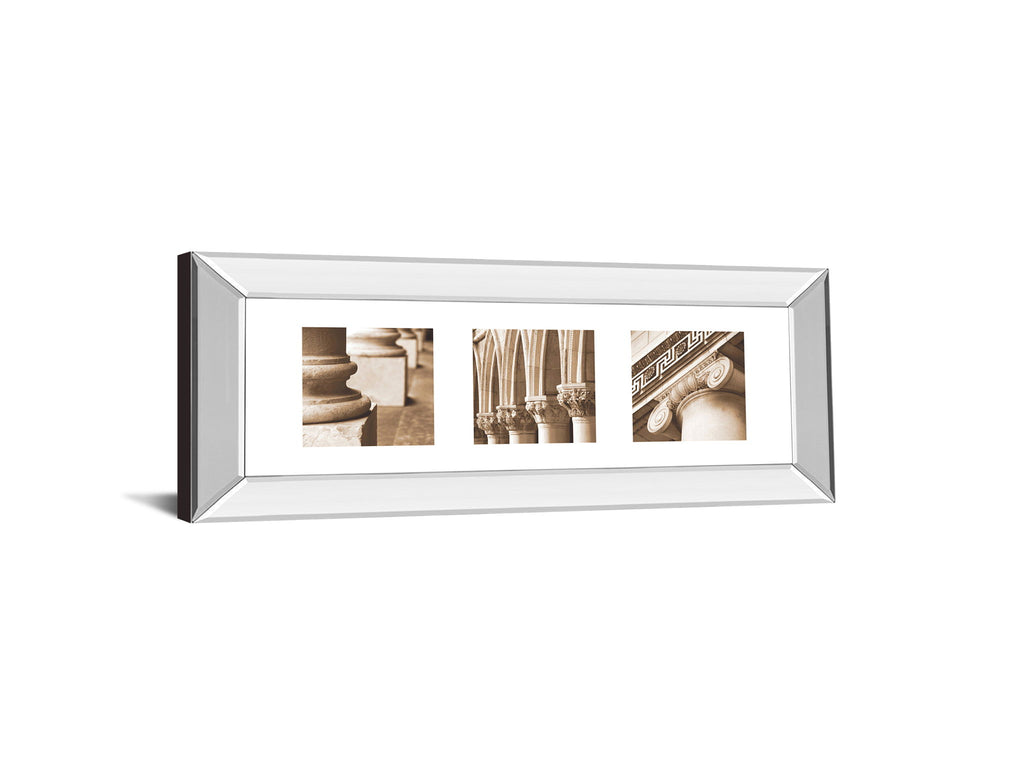 Step into a world where classical architecture meets modern elegance with this captivating triptych. The three sepia-toned photographic panels showcase intricate columns and arches, evoking a timeless sense of grandeur and craftsmanship. Encased in a sleek mirrored frame, the artwork reflects light beautifully, adding depth and sophistication to any living room, office, or hallway. Each panel is protected by premium real glass, preserving the fine details and textures of the stonework with crystal clarity. Expertly crafted and ready to hang, this framed wall art blends historic beauty with contemporary style to elevate your space effortlessly.