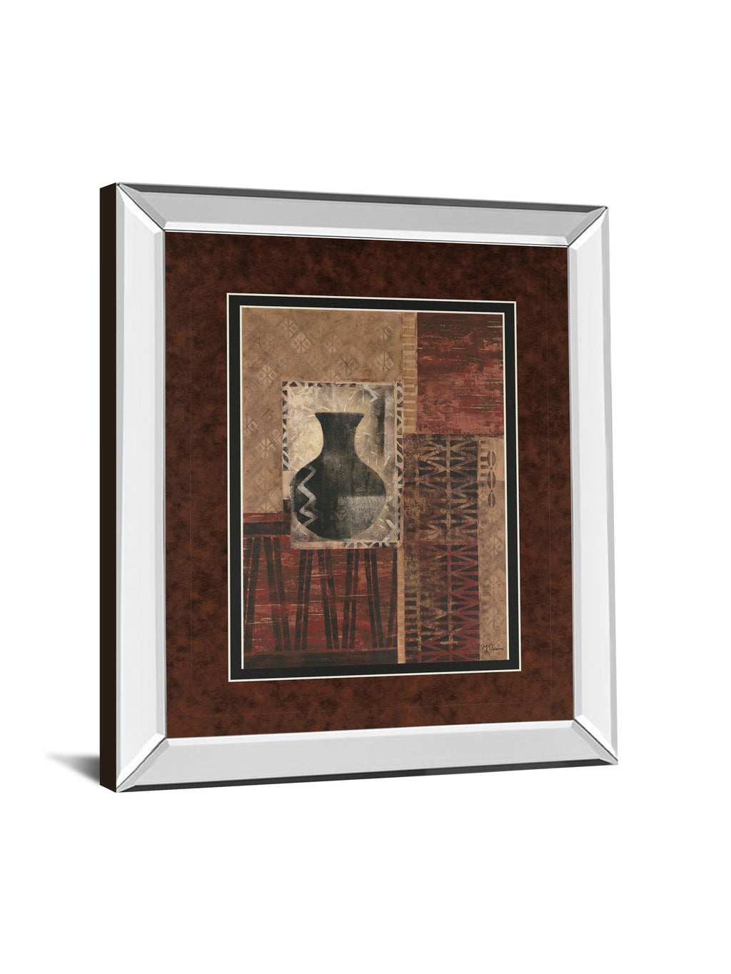 Immerse yourself in the rich textures and earthy hues of this captivating abstract piece. Featuring a striking black vase silhouette set against a backdrop of layered patterns in warm browns, reds, and creams, this artwork invites contemplation and adds depth to any room. Encased in a sleek mirrored frame with double matting and premium real glass, it offers a sophisticated gallery-quality finish that reflects light beautifully, enhancing your living room, office, or study with timeless elegance and modern charm.