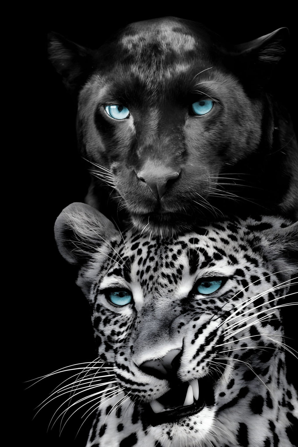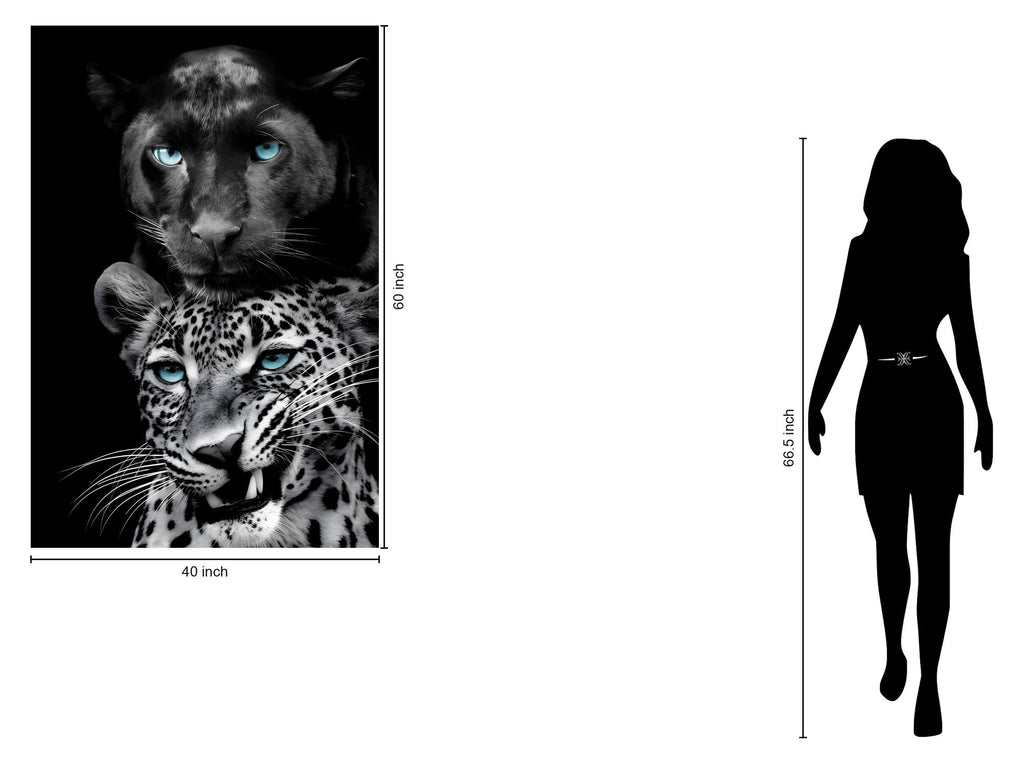 "Big Cats Play Too" captures the majestic beauty and playful spirit of two magnificent big cats through striking high-definition graphic art on durable tempered glass. The intense blue eyes of the black panther and leopard contrast vividly against the monochrome fur and deep black background, creating a dramatic and modern statement piece. Crafted for safety and strength, this frameless artwork features toughened glass and comes ready to hang with angled sawtooth hangers, perfect for adding a bold touch to living rooms, offices, or dens. Each purchase also supports a meaningful cause by providing a meal to a hungry American child, blending art with social impact.