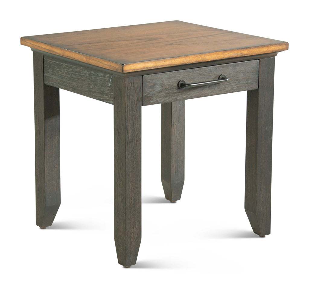 Transitional farmhouse styling with a modern edge, the Bear Creek End Table warms up a room with its two-tone finish. A working drawer offers convenient storage options and the tapered leg offers a contemporary angle to the classic styling. Pair with the Bear Creek Brown Lift-Top Cocktail Table or Sofa Table to complete the look.