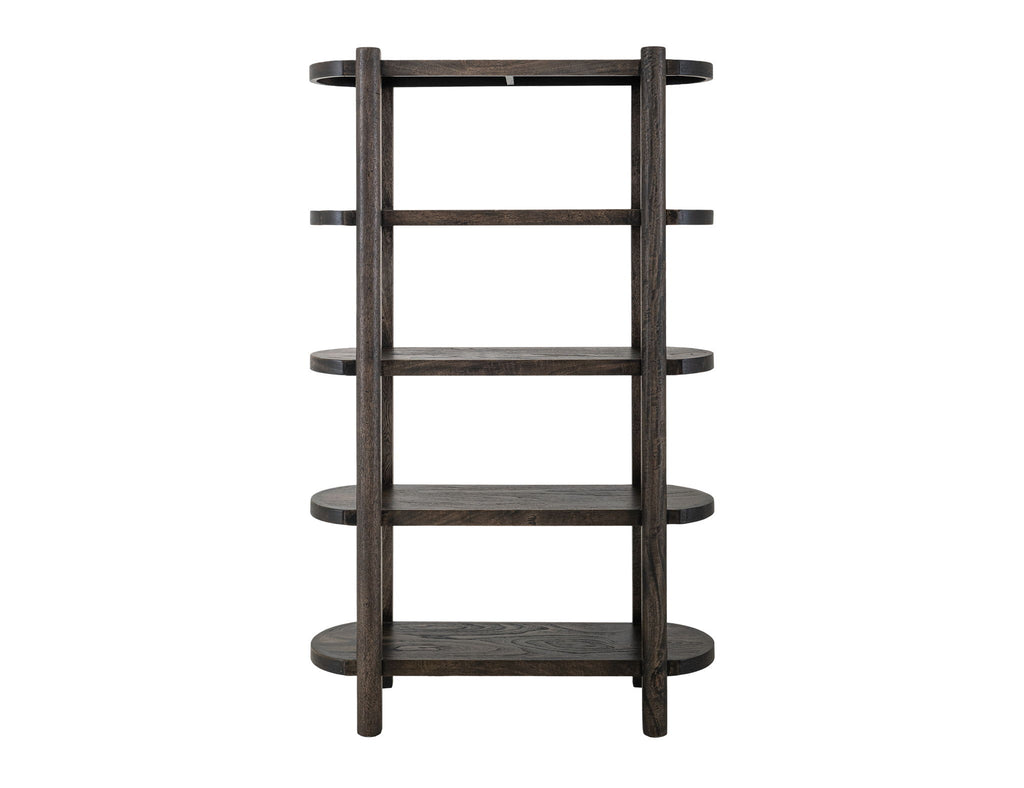 4 Shelves, Bookcase. Our exquisite Black Balam collection is meticulously handcrafted using high-quality mango and teak wood. This simple yet striking collection is designed to infuse your space with an organic, modern aesthetic. The bookcase boasts a unique organic shape, featuring elegantly curved oval shelves and rounded legs, adding a touch of sophistication to any room.