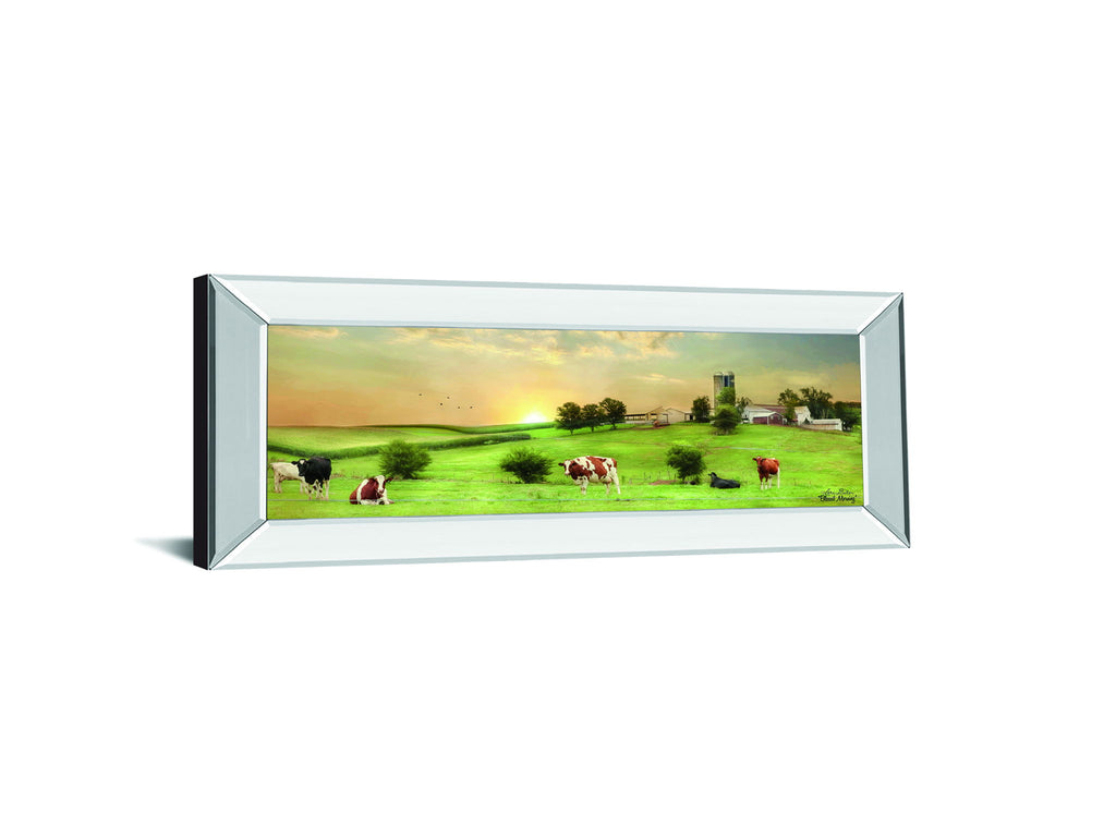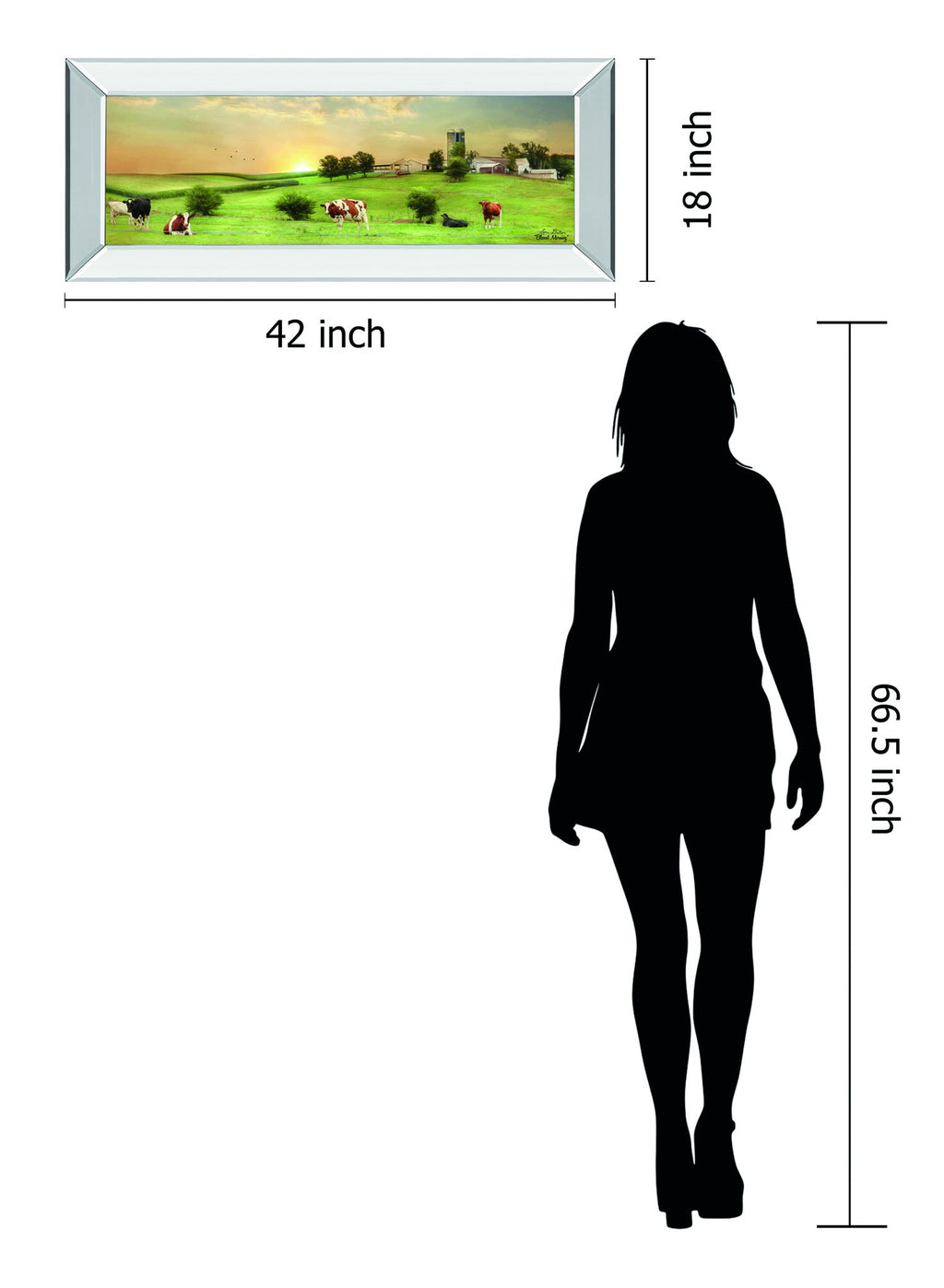 Experience the peaceful charm of a countryside dawn with this captivating framed photographic print. Gentle cows graze on vibrant green fields beneath a soft golden sunrise, evoking a sense of calm and natural beauty. The sleek mirrored frame adds a contemporary touch, making it an ideal addition to farmhouse kitchens, living rooms, or offices where warmth and tranquility are cherished.