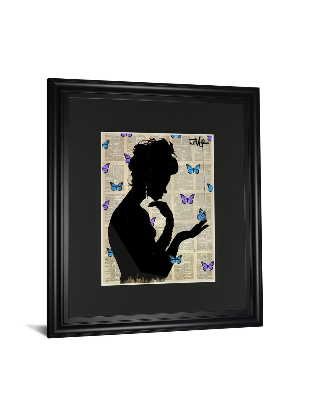 This captivating piece features the graceful silhouette of a woman surrounded by delicate blue and purple butterflies, set against a vintage text backdrop. The interplay of shadow and color creates a serene, contemplative mood that invites quiet reflection. Enhanced by a sleek black frame and double matting, this artwork adds a sophisticated touch of whimsy and elegance to any living room, bedroom, or office space, making it a timeless statement of beauty and quiet charm.