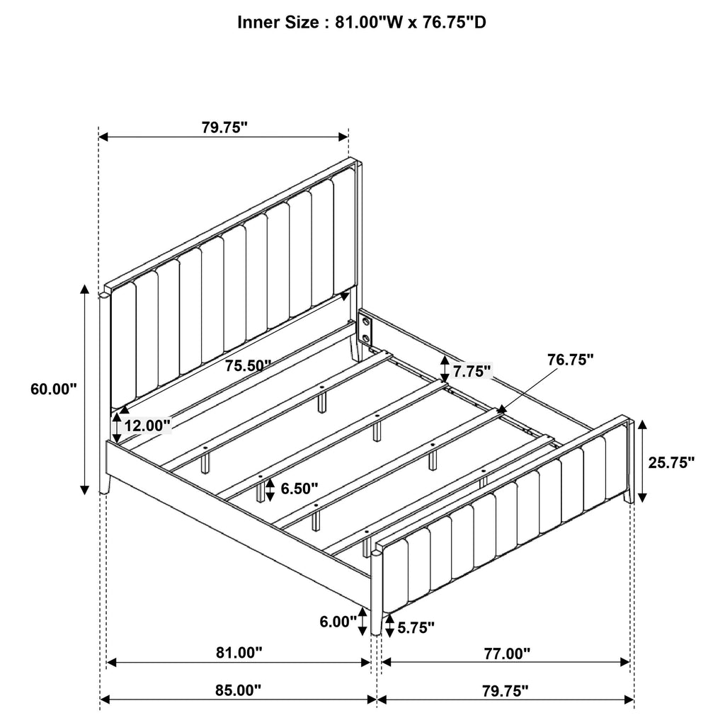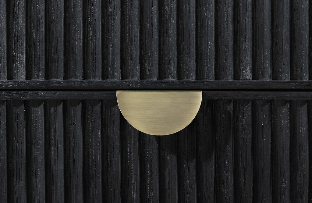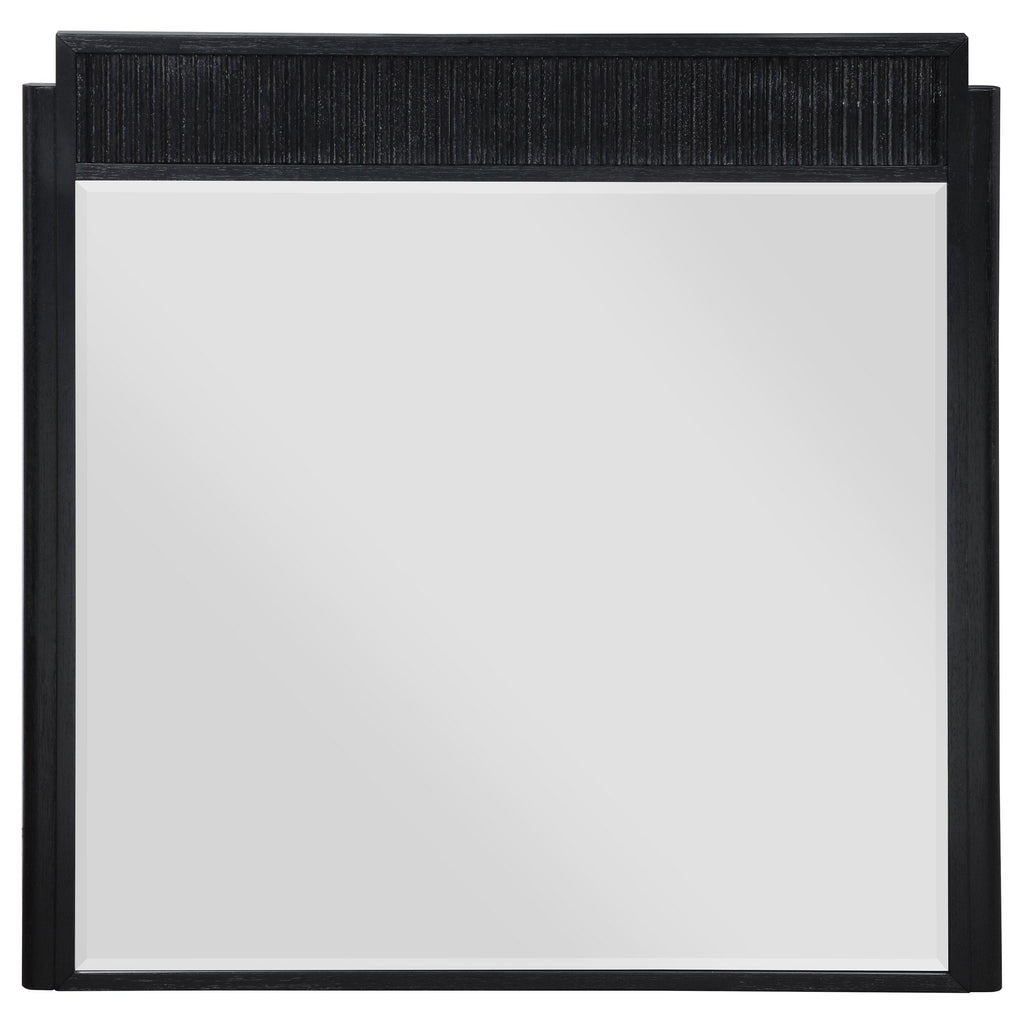 A rich black finish create a sophisticated palette for a four-piece modern bedroom set. Complete with wire brushing that creates texture, the set features fluted details that add elegance and character. The bed features an open silhouette with a low footboard, while a tall headboard centers your space. A two-drawer nightstand includes a felt lined top drawer to protect delicates like your watch or phone, leaving plenty of space in the bottom drawer for books and other essentials. The dresser and mirror set completes the look, offering plenty of storage in eight drawers, including felt lining in the top two, for clothing and accessories. Key Features: • Stylish and modern, a contemporary wood bedroom set features a wire brushed black finish • Square headboard and footboard create a complementary pairing and open silhouette • Fluted texturing highlights the bed, nightstand, dresser and mirror • Drawers feature demi-lune metal handles in a warm golden tone for sophisticated contrast • Bed includes slats with support legs to provide an excellent base for your mattress set • Drawers feature English dovetail joinery for excellent craftsmanship