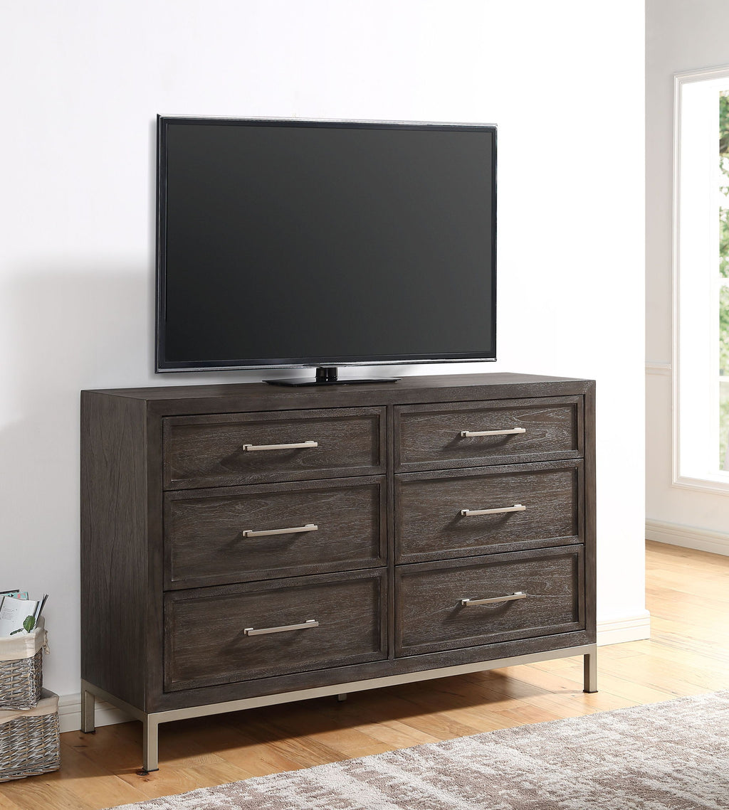 With a modern take on transitional styling, Broomfield is a study in simplicity with clean lines and an elegant mix of materials. This Dresser is sleek, yet warm and inviting with a warm walnut color finish that beautifully complements the champagne finished metal on bases and hardware. Picture frame drawer fronts add just the right amount of trim to accent the Dresser perfectly.