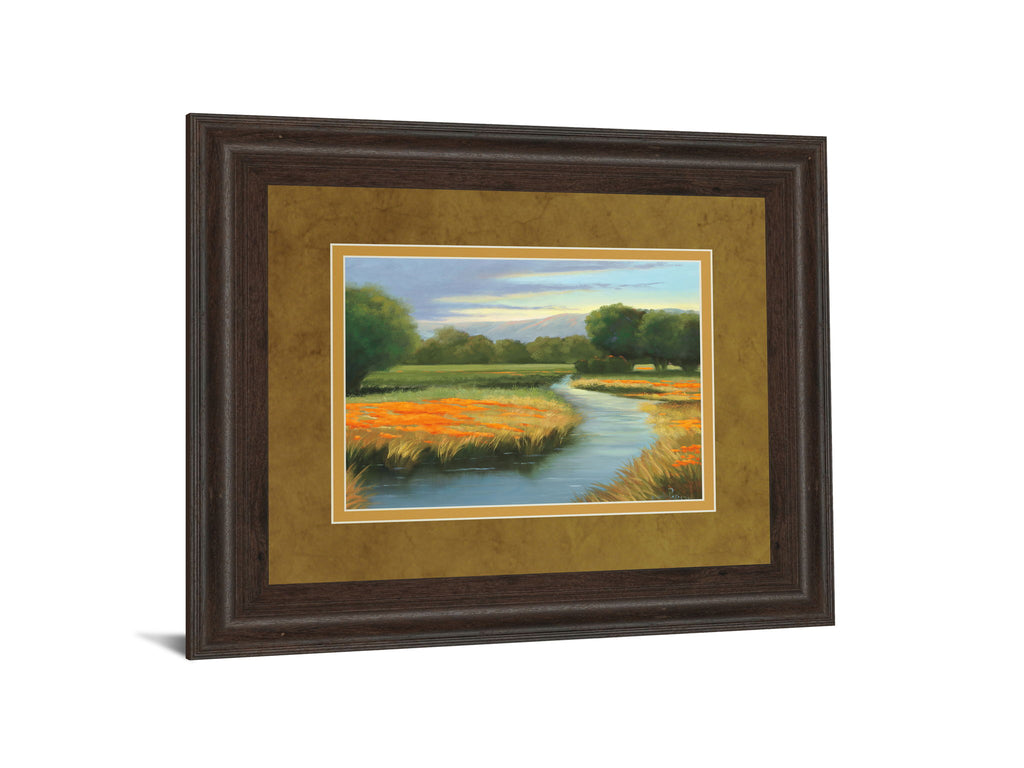 Step into a peaceful riverside scene with this captivating oil painting that brings nature's vibrant colors into your home. The artwork showcases bright orange wildflowers blooming alongside a gently flowing blue river, set against lush green fields and distant hills under a soft sky. Encased in a warm cinnamon mocha frame with double matting in complementary tones, this piece offers a gallery-style finish protected by premium real glass. Sized at 34 by 40 inches, it’s ready to hang and infuse your living room or office with a serene, contemporary charm that invites calm and inspiration.
