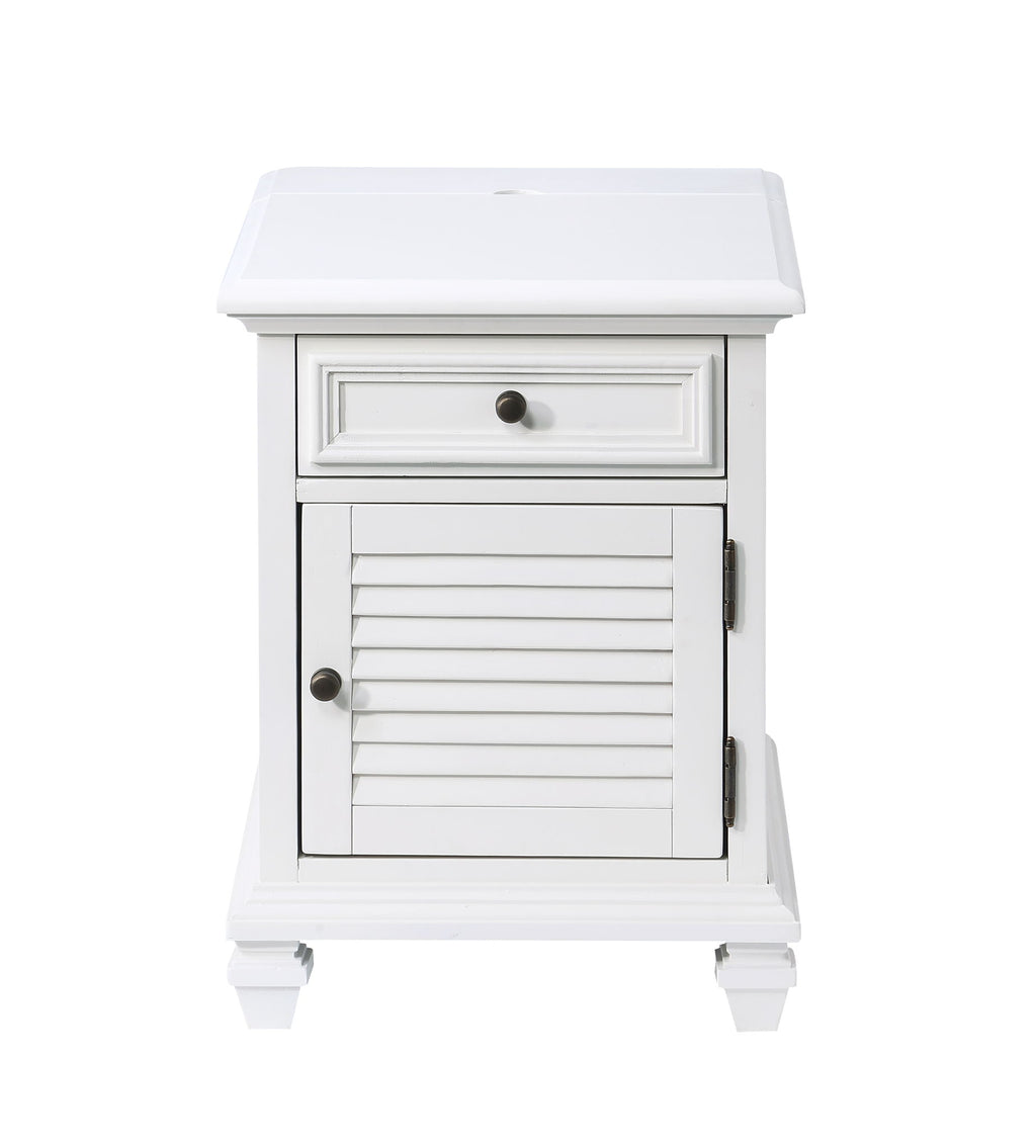 Modern farmhouse design in a compact design that fits comfortably beside a chair or as a companion piece to a Sofa and Loveseat. This Charlestown table offers looks and function with a pop-up power strip that offers convenient recharging of devices with a built-in USB recharging station. All of this is a crisp white finish with louvered doors and contemporary bun foot in a transitional package that will fit in any room.