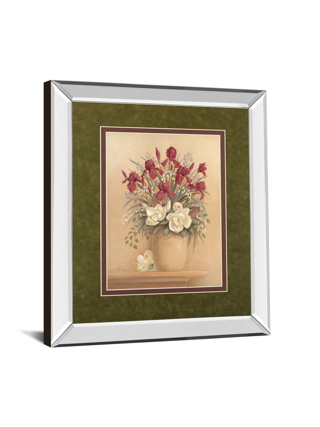 Classic Petal I captures the timeless beauty of a lush floral arrangement featuring deep red irises and creamy white magnolias resting elegantly in a softly textured vase. The artwork is enhanced by a sleek 2.5-inch mirrored frame that adds a modern reflective dimension, while the double mat in rich earth tones provides a refined gallery-style finish. Protected by premium real glass, this piece ensures lasting vibrancy and clarity, making it a sophisticated addition to any living room, bedroom, or office. Ready to hang, it effortlessly elevates your décor with its harmonious blend of classic charm and contemporary style.