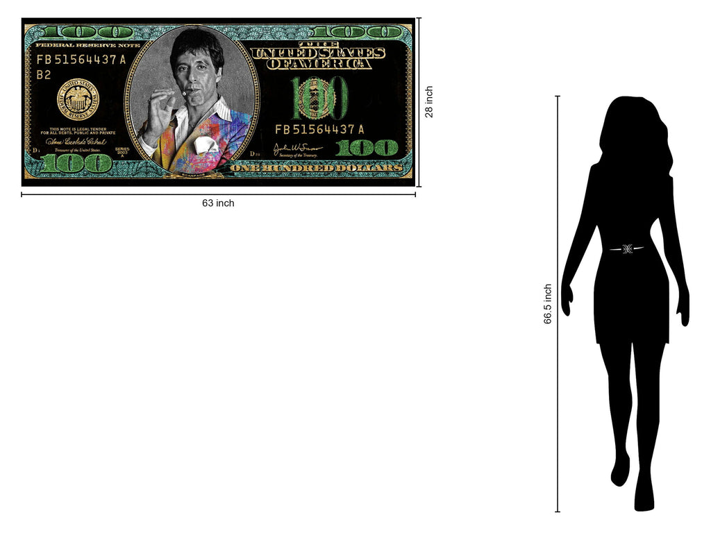 This striking "Classic Cinema Money Pop Art Canvas" captures the iconic image of Scarface in a bold, contemporary style. Hand-painted on a high-quality gloss canvas, this piece features vivid, hand-applied accents that bring depth and texture to the artwork. The colorful jacket contrasts with the monochrome portrait, set against a stylized money background, creating a unique blend of pop culture and artistic flair. Ready to display with professional mounting hardware, this graphic art piece is perfect for living rooms, offices, or entertainment spaces seeking a dynamic and expressive focal point.