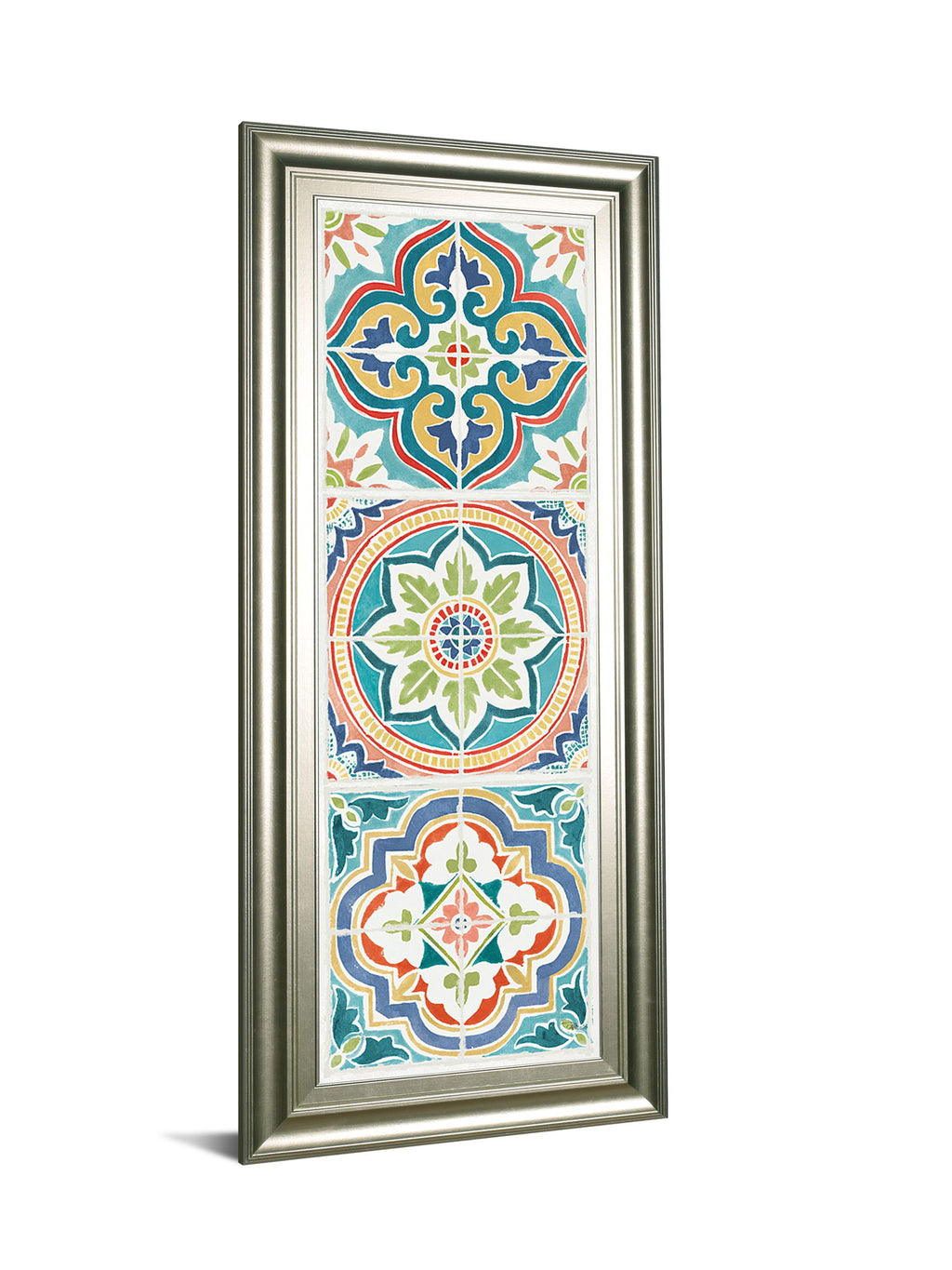 This vibrant geometric mosaic wall art brings a lively burst of color and intricate design to any room. Featuring a harmonious blend of blues, greens, reds, yellows, and oranges, the piece captures the essence of handcrafted tile patterns with a modern twist. Encased in a sleek silver frame with premium real glass, it offers both elegance and durability, making it a perfect addition to living rooms, offices, or hallways seeking a sophisticated yet energetic focal point.