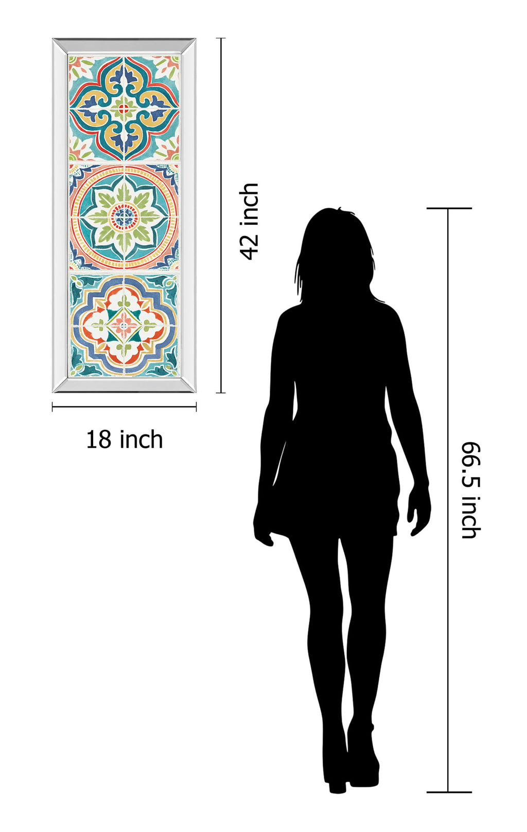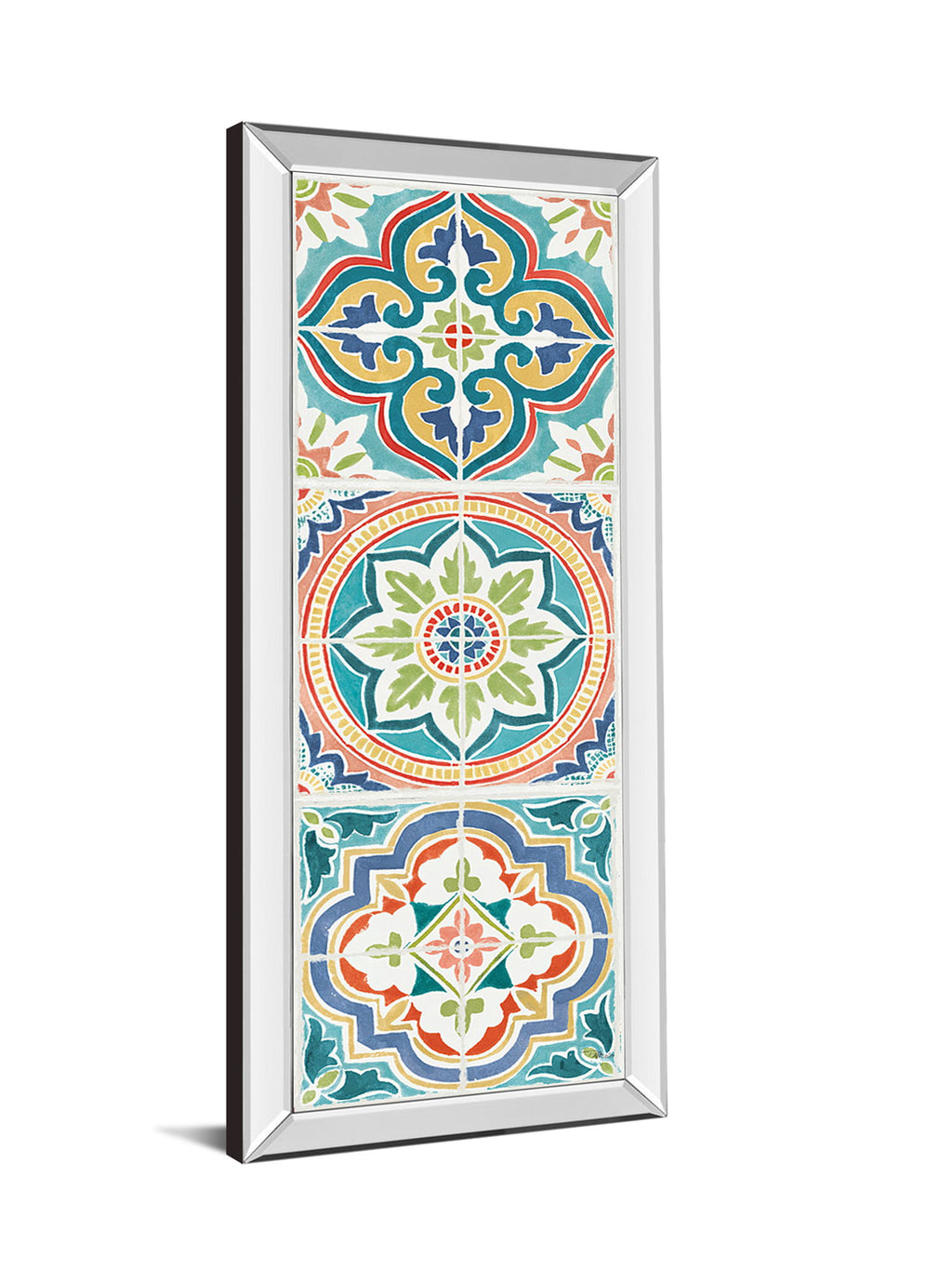 Mosaic Harmony invites you into a vibrant world where color and pattern dance together in perfect balance. This vertical piece showcases a lively arrangement of abstract mosaic designs in rich blues, greens, oranges, and reds, all framed by a sleek mirrored border that reflects light and adds depth. Crafted with premium real glass to enhance every hue and detail, this artwork brings a fresh, contemporary elegance to any living room, office, or hallway. Ready to hang and made with expert craftsmanship, it transforms your space with a burst of artistic energy and timeless charm.