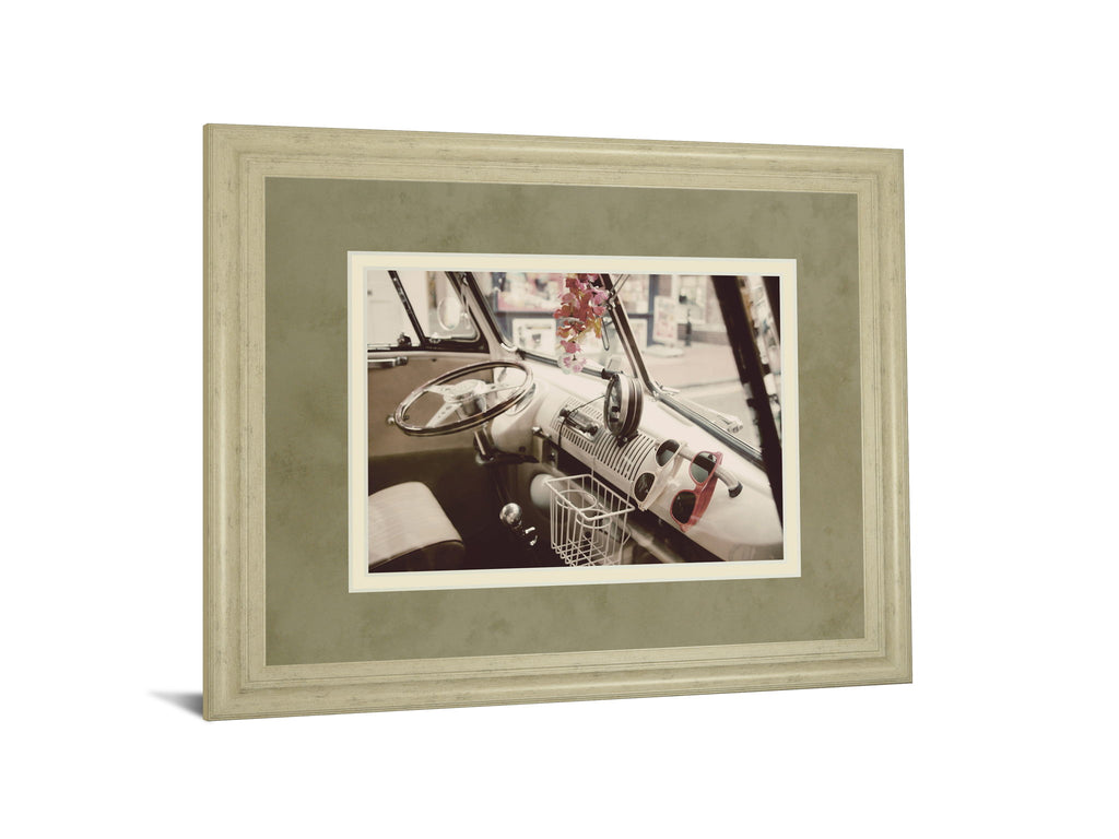 Immerse yourself in a moment frozen in time with this captivating photograph of a vintage vehicle's interior. The soft ivory frame and double matting in beige and cream hues enhance the nostalgic atmosphere, highlighting the delicate details like the classic steering wheel and charming accessories. Perfect for adding a touch of timeless elegance to your living room, office, or den, this piece invites you to appreciate the beauty of retro design and the stories it holds. Expertly crafted and ready to hang, it’s a refined tribute to the golden era of transportation.