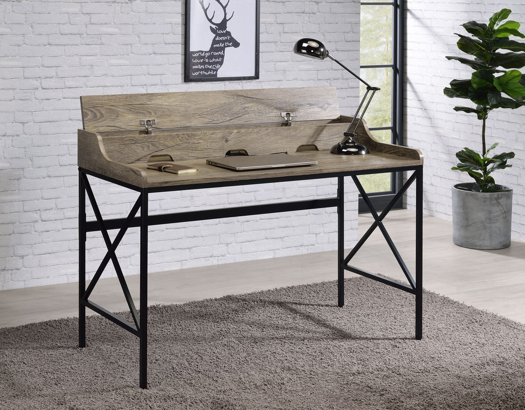 - Grey wood look with black geometric metal accents give the Desk amodern rustic feel for today's contemporary offices or homes