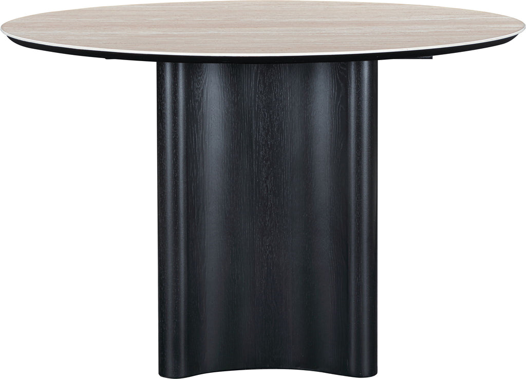 With its sleek silhouette and durable construction, the Corvina travertine sintered stone and oak veneer dining table is a timeless investment. Its striking contrast of circular sintered stone top and wavy oak veneer base curate a unique design to elevate any space. As a focal point piece, its sophisticated design can be used in a variety of contemporary settings to blend luxury and functionality effortlessly.