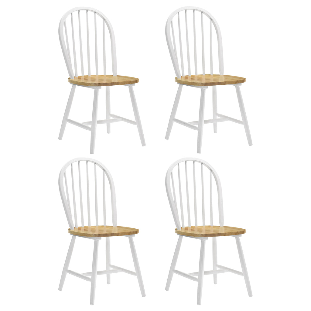 A timeless design meets everyday functionality with this classic Windsor-style side chair. Crafted from a blend of solid rubberwood and engineered wood, it offers durability and charm for casual dining spaces. The arched spindle backrest provides gentle support, while the contoured seat ensures comfort. A two-tone white and natural brown finish enhances its traditional appeal, making it a versatile addition to farmhouse, cottage, or transitional dining areas. Key Features: • Windsor-style side chair with a timeless arched spindle backrest • White and natural brown finish enhances classic farmhouse appeal • Crafted from solid rubberwood and engineered wood for durability • Contoured seat provides enhanced comfort for everyday dining • Sturdy legs with stretchers ensure long-lasting stability and support • Versatile design complements cottage, farmhouse, and transitional decor