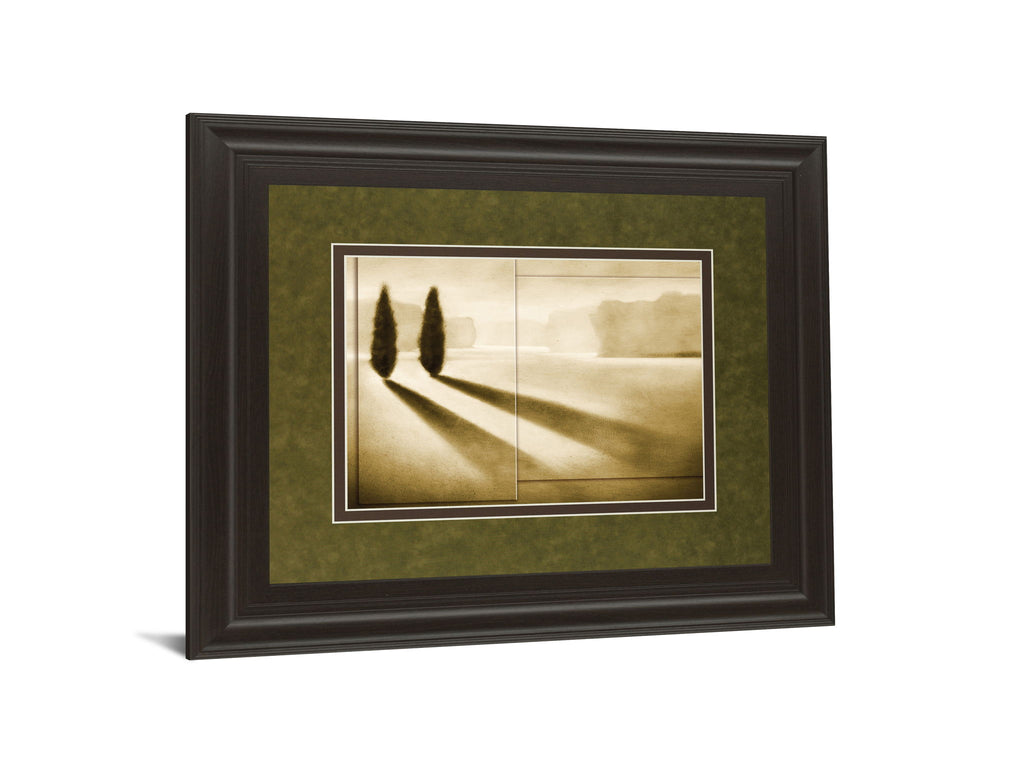Step into a tranquil scene where two slender cypress trees cast elongated shadows across a softly lit field, evoking a sense of calm and contemplation. This framed wall art features a rich dark chocolate frame paired with double matting in olive and brown hues, enhancing the artwork's depth and warmth. The premium real glass finish brings out the subtle sepia tones and textured details, making it an elegant addition to any living room or office. Ready to hang, this piece effortlessly blends contemporary style with timeless serenity, creating a refined focal point that invites peaceful reflection.