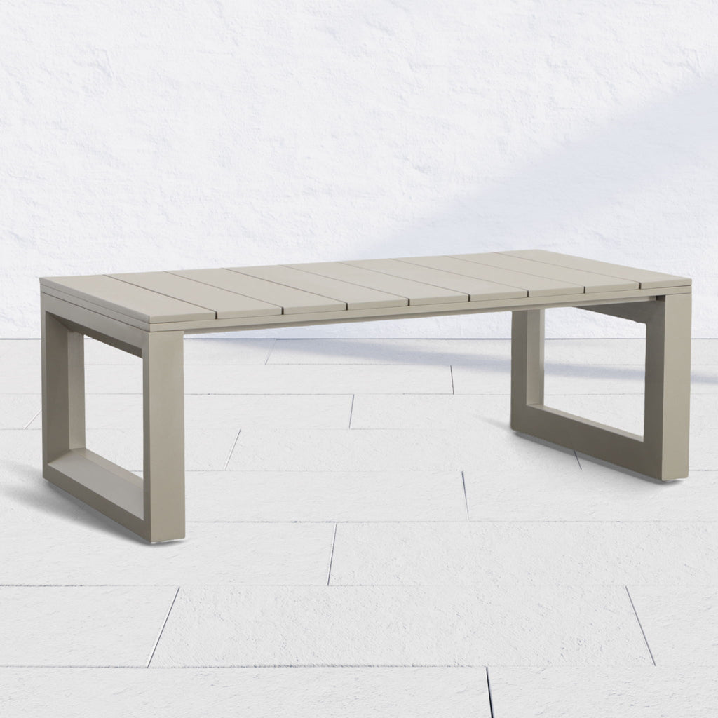 Neutral contemporary style in an outdoor set that will make your patio a showcase. This Cocktail Table looks like it was sculpted for the great outdoors with beveled end panels that frame a modern geometric pattern. And although it looks like an indoor item, this table is built for the outdoors with a rust resistant aluminum frame that is also scratch and weather resistant.