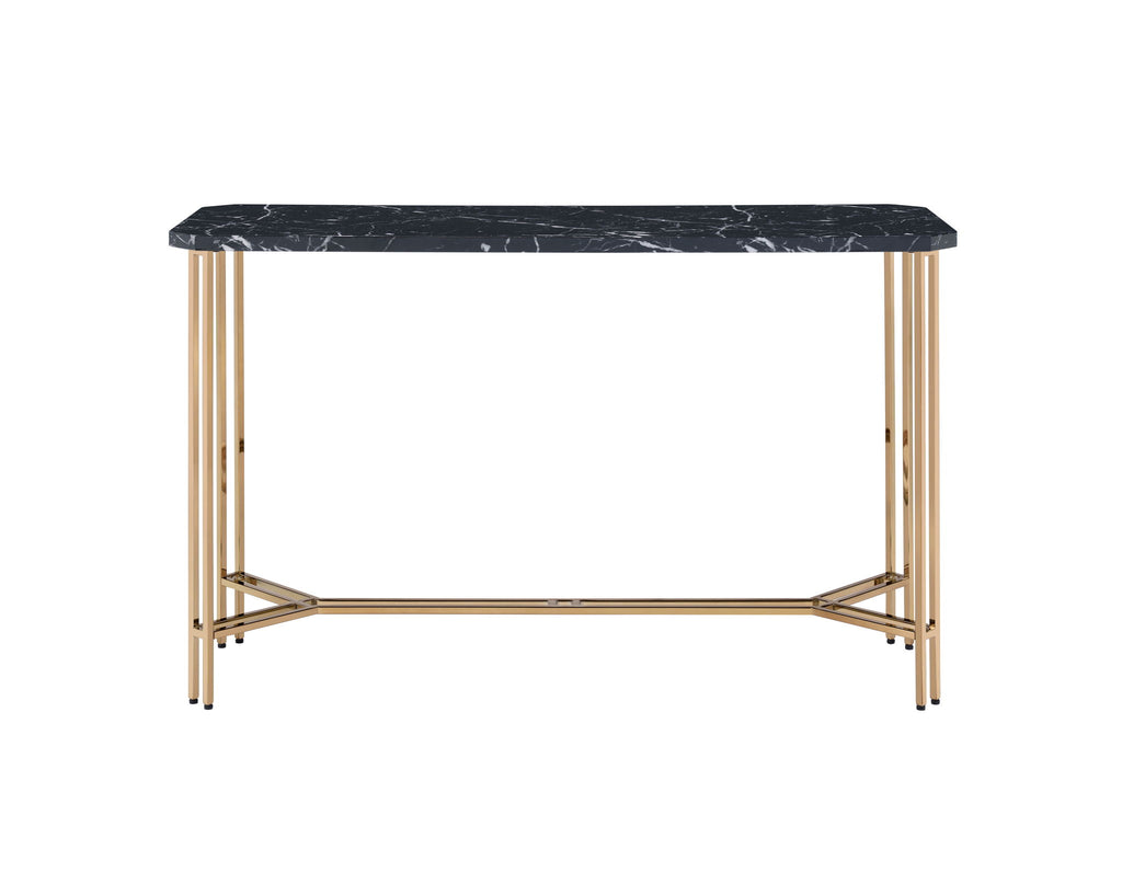 An elegant Sofa Table with a glamorous profile to dress up any room. A lustrous black faux-marble top complements the golden champagne iron legs in a design reminiscent of the glamorous styles of old Hollywood. Clipped corners and cross-stretchers add just the right touches to the style for a beautiful and practical hall table, Sofa Table or Entertainment piece.