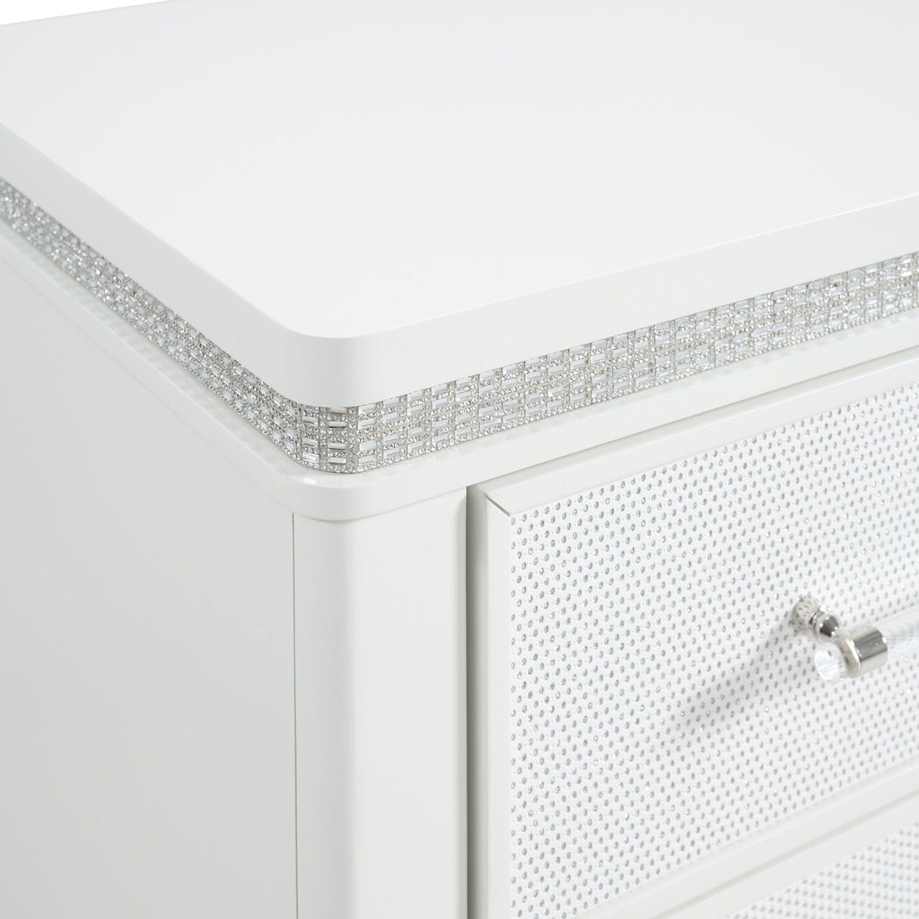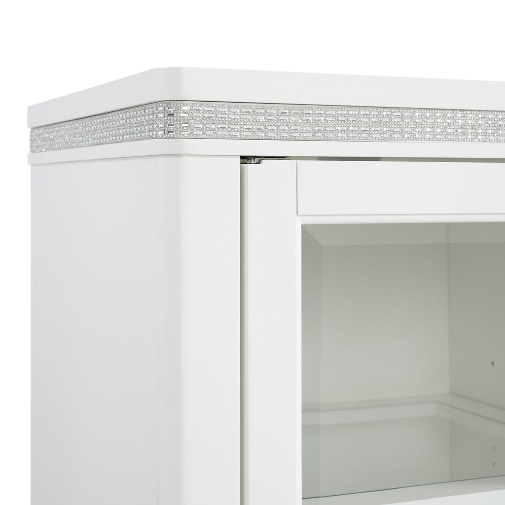 Enrich your dining room with the showstopping style of the Diedra Server and Hutch. Accented with LED lighting, glass door fronts, acrylic knobs, and rhinestone detailing, the exuberance of glam style is woven into every inch of these stunning pieces. Adjustable shelving in both the hutch and server allows you to customize your storage and display space, while felt-lined top drawers in the server are included to protect the furniture and its contents alike. Made with solid wood framing and finished in a quality birch veneer, the Diedra Server and Hutch is the perfect statement of quality and style.