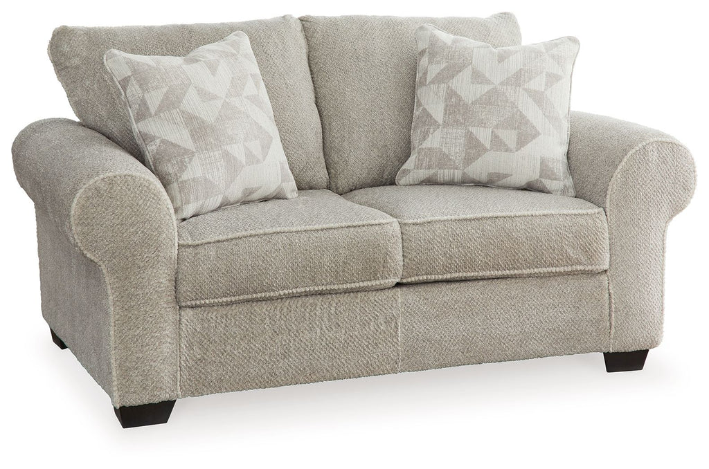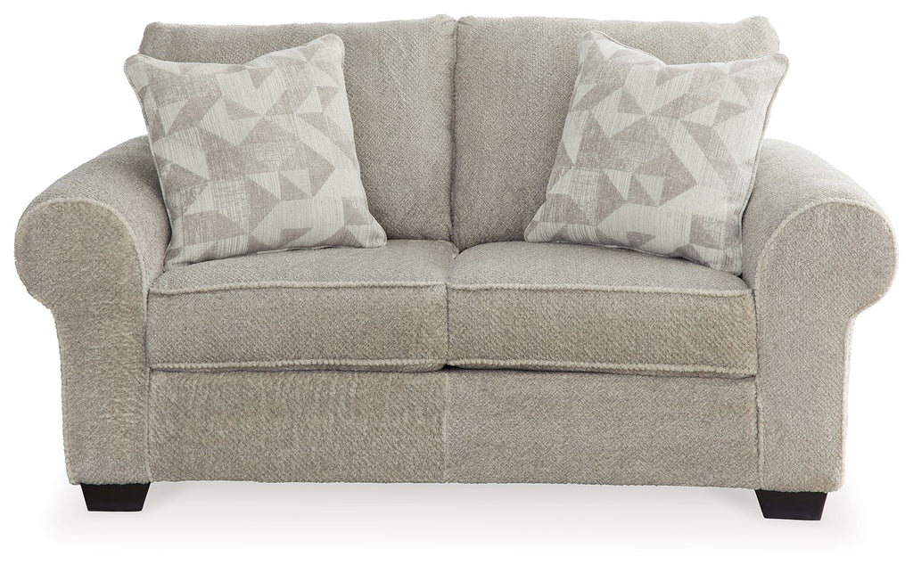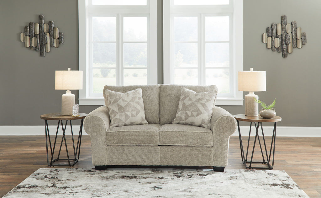 Everyday form, superb function. Framed with roll arms for a dash of flair, this loveseat sets its sights on trendy transitional design. The neutral hue meshes with multiple color palettes, providing chic seating wherever you need it most. Soft-to-the-touch fabric aids you in superior relaxation. Now that's universal style, made simple.