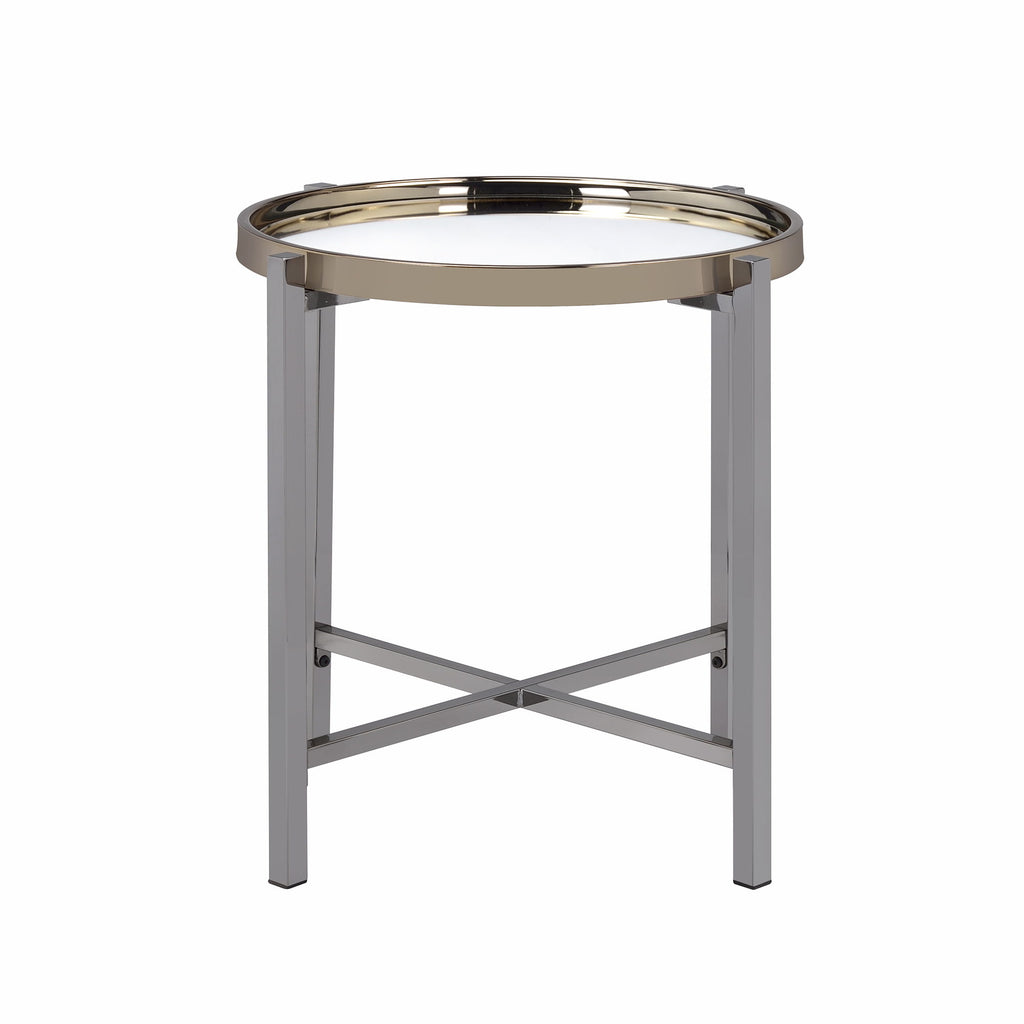 The Edith Round End Table is the perfect addition to your home! This end table features a mirrored table top, that is also tray like; so everything will stay on the table and not fall off! The table top edge is finished in a gold, while the legs are in a dark nickel. The base of the table features stretchers that cross at the bottom providing extra support without losing style! This end table is super stylish and ideal for small space living!