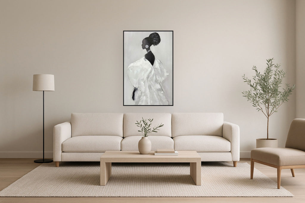 This stunning acrylic painting captures the elegance of a silhouetted figure in a flowing gown. The monochrome palette adds a timeless sophistication, making it a perfect centerpiece for any room. Its vertical orientation and framed design enhance the artwork's graceful presence.