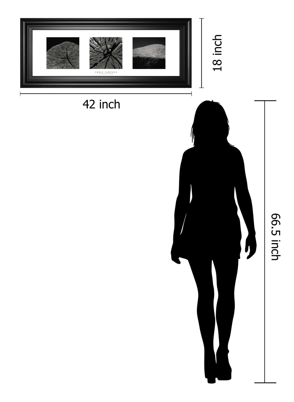 This captivating triptych invites you to explore the subtle beauty found in nature's simplest elements. Featuring three close-up black and white photographs of weathered wood and stone, each image reveals intricate textures and patterns that tell a story of time and resilience. Encased in a sleek black frame with a crisp white mat, this piece adds a serene and sophisticated touch to any living room, office, or bedroom. Crafted with premium materials and clear glass, it is ready to hang and designed to inspire a daily appreciation for the quiet wonders of the natural world.