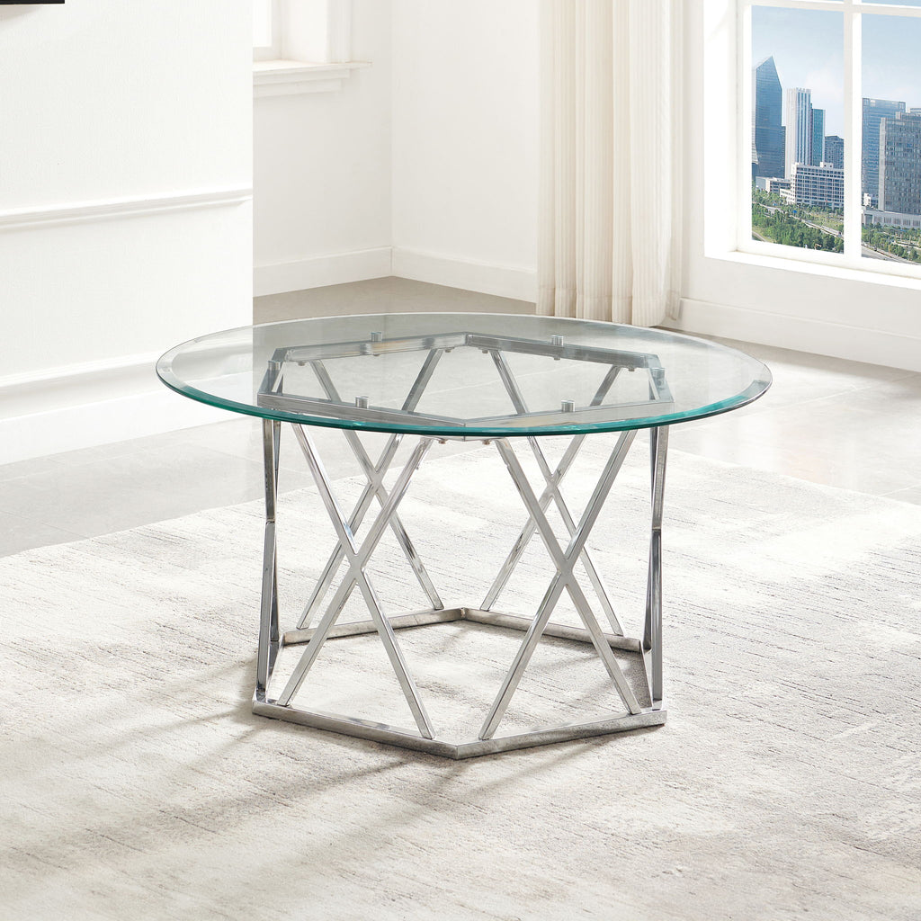 A sophisticated modern silhouette, the Escondido Cocktail Table offers a sparkle to any room. A tempered glass top and chrome plated base combines with geometric angles in an architecturally styled base. The 36-inch round table works well with sectionals and sofa and loveseat sets to add a gentle flowing aesthetic and easy access around the table.
