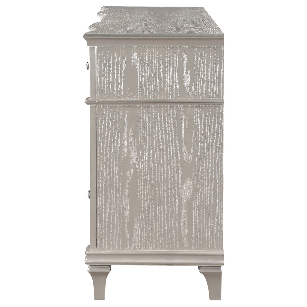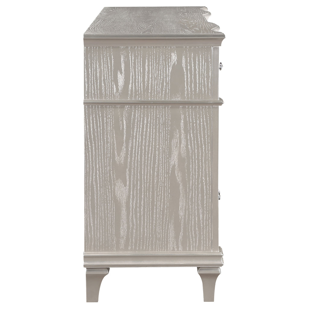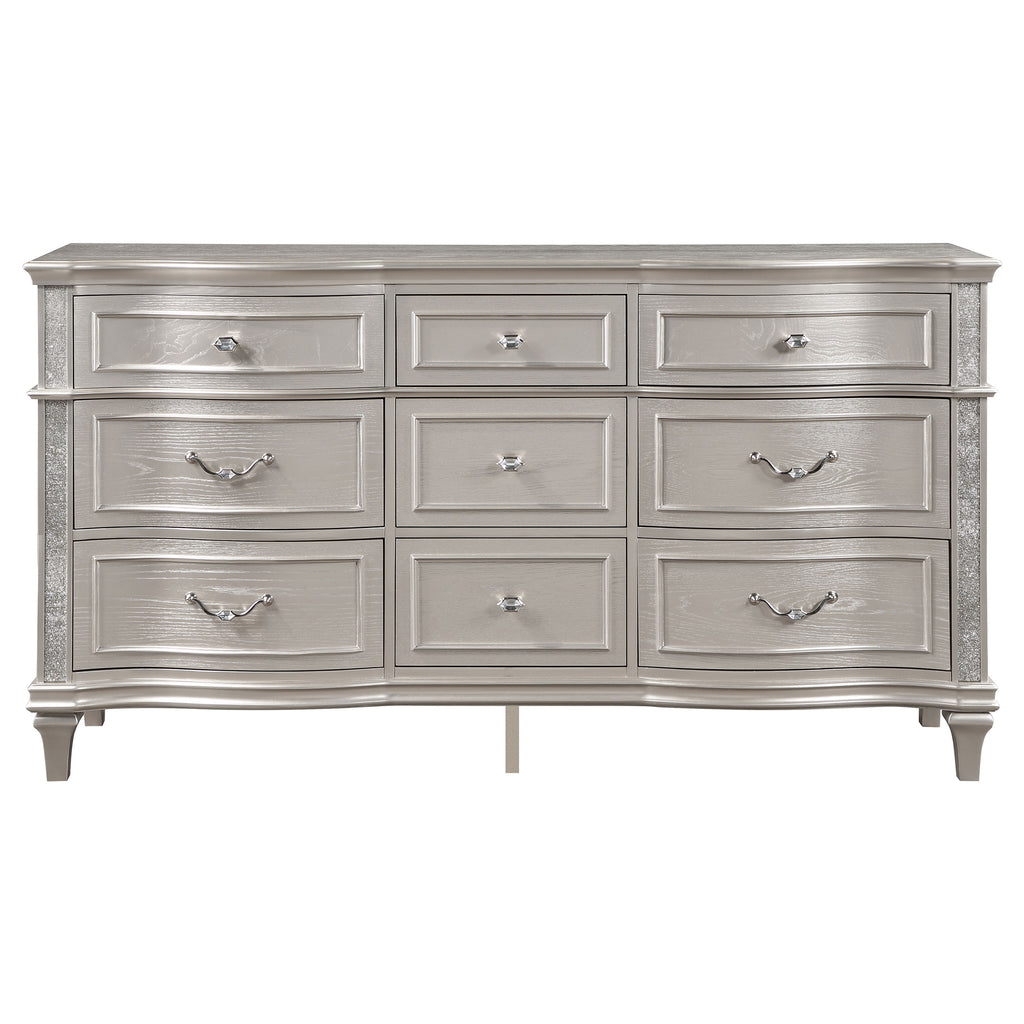 A silver oak finish creates an elegant touch to this glam nine-drawer dresser. Hexagon-shaped knobs and drop bail handles appointed with pearl accents adorn each of the nine spacious drawers for a luxurious look and feel. Keep delicate essentials organized within the grey felt-lined top drawers and garments in the deep bottom drawers. Across the dresser front is a curved facade that sweeps through the drawer fronts and ends at two sparkling column panels. Charming wood molding details along the top and bottom, along with intricate trim, offer a classical flair. Key Features: • Nine spacious drawers including top felt-lined drawers for organizing essentials • Glittering accent panels bring sparkling sophistication to any bedroom • Silver oak finish is elegant and modern, delivering a glam finishing touch • Hexagonal shaped hardware with pearl-like center accents offer a modern flair • Turned tapered feet give a slight elevation that reveals the curvy front facade and drawers panels