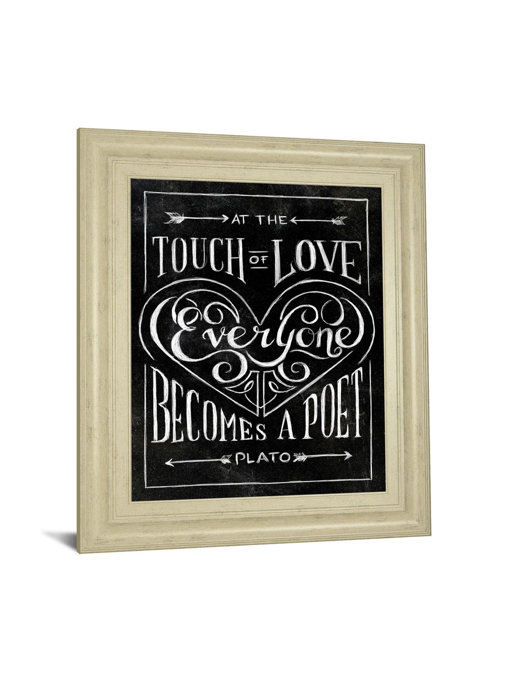 This captivating framed wall art features the inspiring quote, “At the touch of love everyone becomes a poet,” elegantly hand-lettered in white against a rich blackboard-style background. The intricate typography is framed by a wide ivory bliss frame that adds a warm, timeless charm to any room. Crafted from high-quality MDF and protected by crystal-clear glass, this piece is designed to brighten living rooms, offices, or hallways with its heartfelt message and sophisticated style. Ready to hang and proudly made in the USA, it’s a perfect blend of motivation and classic elegance for your home.