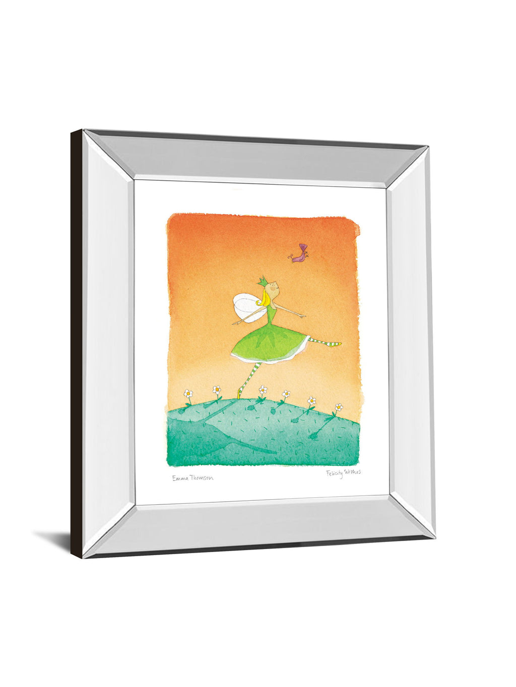 Step into a world of whimsy and delight with this charming artwork featuring a joyful fairy dancing atop a lush green hill under a warm orange sky. The playful figure, dressed in vibrant green with delicate wings, reaches out to a curious bird, inviting imagination and wonder. Encased in a sleek mirrored frame, this piece brings a touch of elegance and light to any child's room, nursery, or play space, inspiring creativity and happiness with its bright colors and enchanting scene.