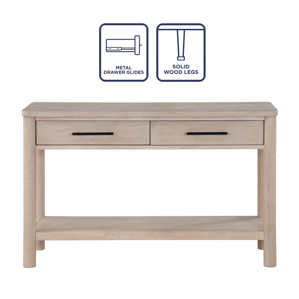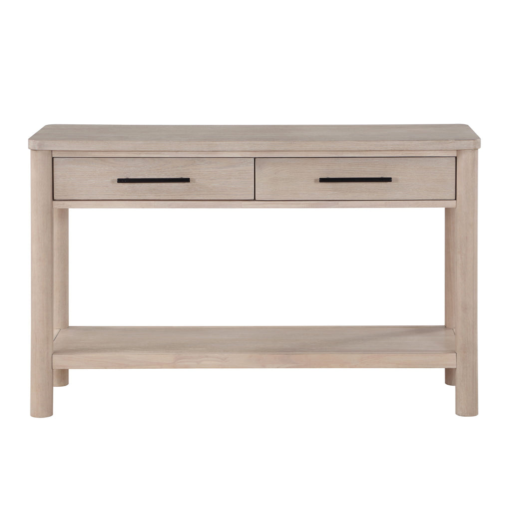 The Gabby Sofa Table captures the laid-back elegance of California with its modern lines and rounded corners, effortlessly combining functionality with coastal sophistication. With a washed oak finish over oak veneers and Asian hardwoods, this table completes a room whether positioned behind a sofa, in a hallway or working as a small entertainment center. Rounded corned and pilasters add a softer touch to the design while dual working drawers offer much needed storage for amenities. A bottom shelf offers an ideal place for display or additional storage while strenghtening the frame for years of use. Light, airy with a casual look that is still elegant, Gabby is sure to brighten your home.
