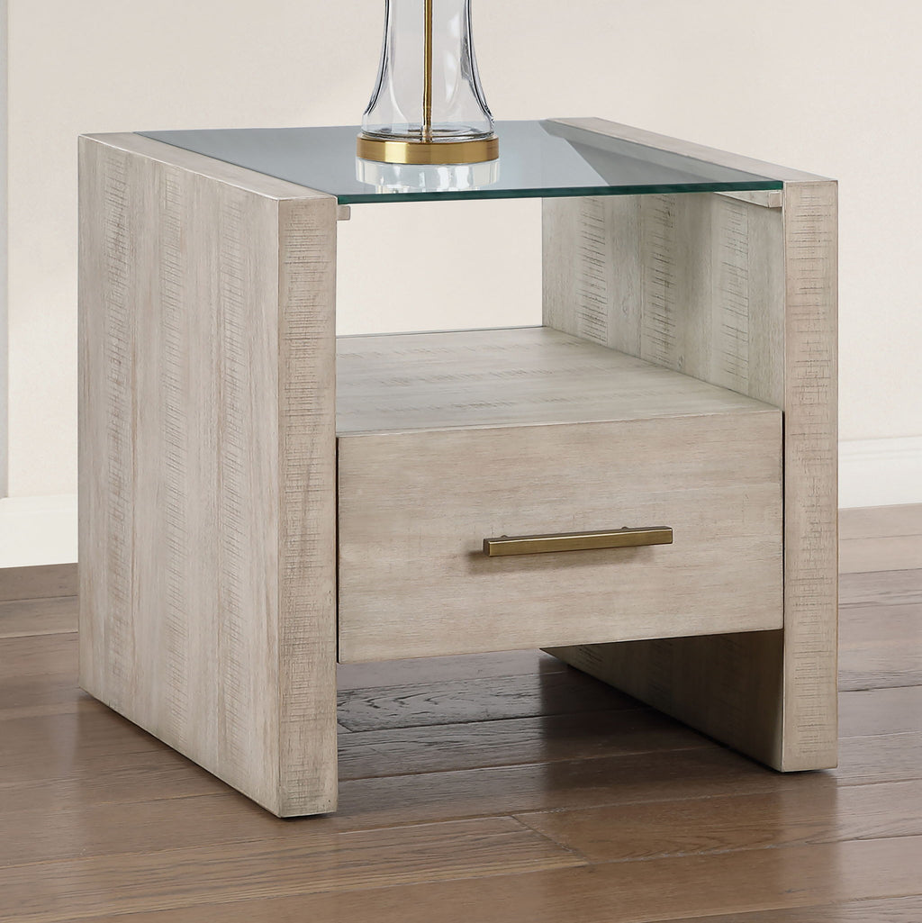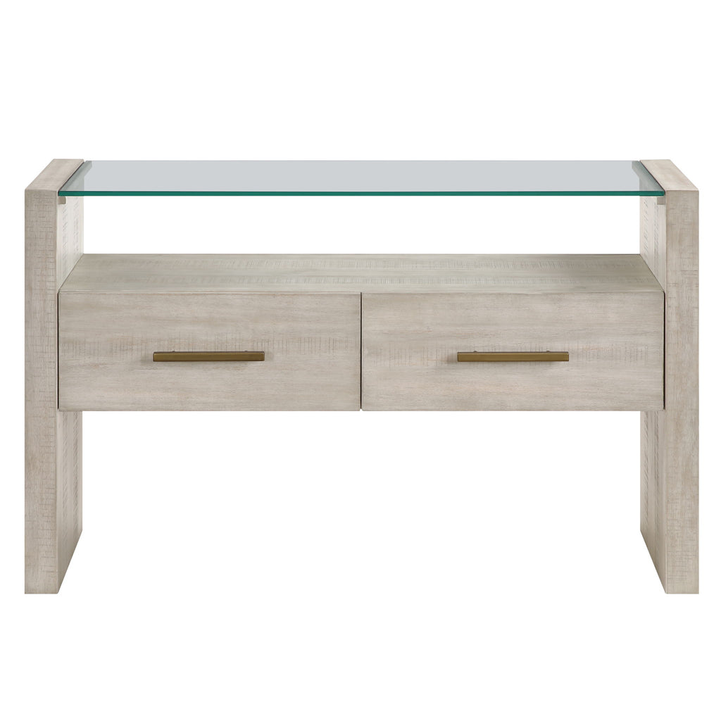 Bring casual elegance to your living room with the Garland Table, a stylish blend of modern design and rustic charm. Its clean lines and saw rasp distressing in a cool washed parchment finish create a contemporary focal point for the living room. The clear glass top offers a lovely display area, while two drawers provide convenient storage for essentials. With hidden casters, it’s easy to move the table for cleaning or when you need extra space to relax. This coffee table is both functional and chic, perfect for any home.