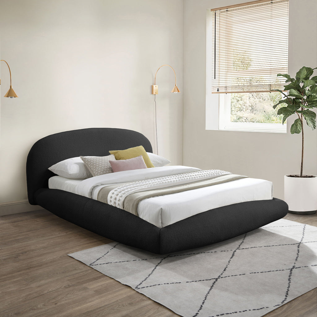 Refresh your bedroom with the Genesis tan faux shearling teddy fabric bed, upholstered in soft plush. The rounded headboard, rails, and footboard create the illusion of a floating bed, introducing a sleek contemporary touch to your space. Combining comfort and style seamlessly, this bed's luxurious fabric and innovative design make it a standout centerpiece. It's perfect for enhancing both the elegance and relaxation of your bedroom.