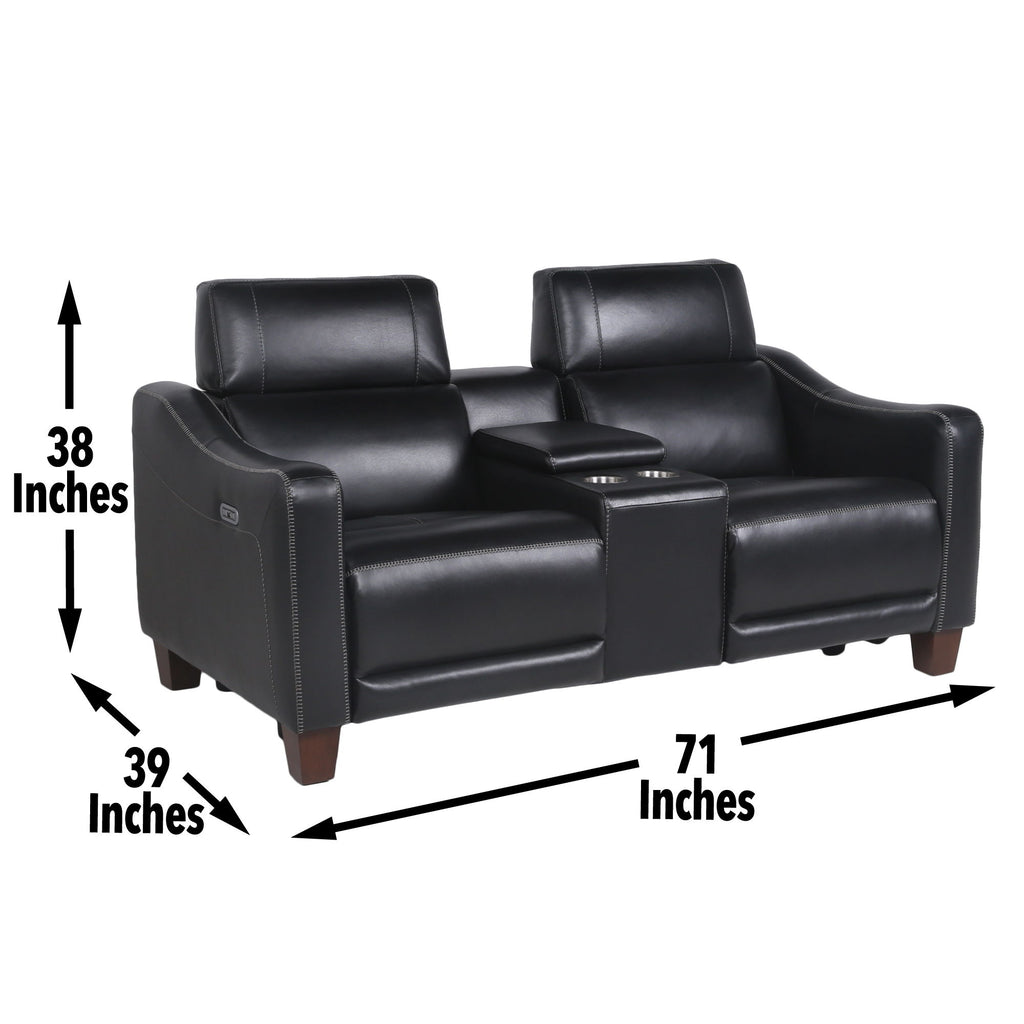 Transitional design in a dual-power leather Loveseat. This Loveseat works well when paired with the matching Sofa and Recliner or when used in smaller areas where space is at a premium. Both seats recline and feature top grain leather, stylish high-leg design and wall-saver reclining mechanism that ensures you won't bang up any walls. The midnight color matches virtually any decor scheme while ensuring comfort every time. The center console offers command central with hidden storage for those pesky, easy-to-lose remotes.