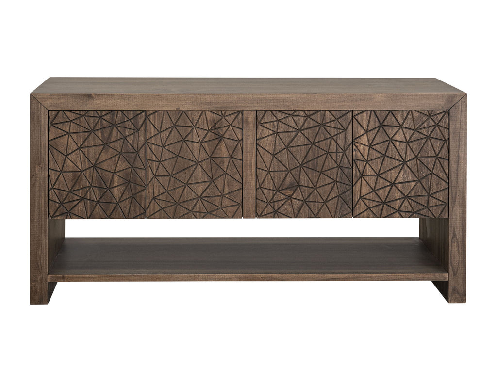 4 Door, Console. This exquisitely crafted console seamlessly blends artistic design and practical functionality. The skillfully carved doors add to its aesthetic appeal and provide a sense of sophistication that will impress. The clean-lined design is thoughtfully complemented by a discreet pull system, ensuring a seamless and elegant appearance. Additionally, the console offers generous open space, allowing you to elegantly display your favorite decorative pieces and further enhance the overall ambiance of your space.
