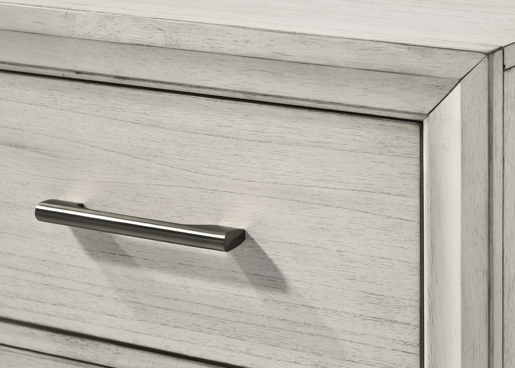 This bedroom set offers a sleek and stylish update to any space, featuring a rich, dark finish that commands attention while maintaining a sense of warmth and coziness. The bed stands as the stunning centerpiece, with its high, padded headboard upholstered in a plush fabric that invites relaxation and comfort. Flanking the bed are matching nightstands, providing convenient access to storage and display space. The set is rounded out with a capacious dresser, accented with a broad mirror that adds depth and brightness to the room.