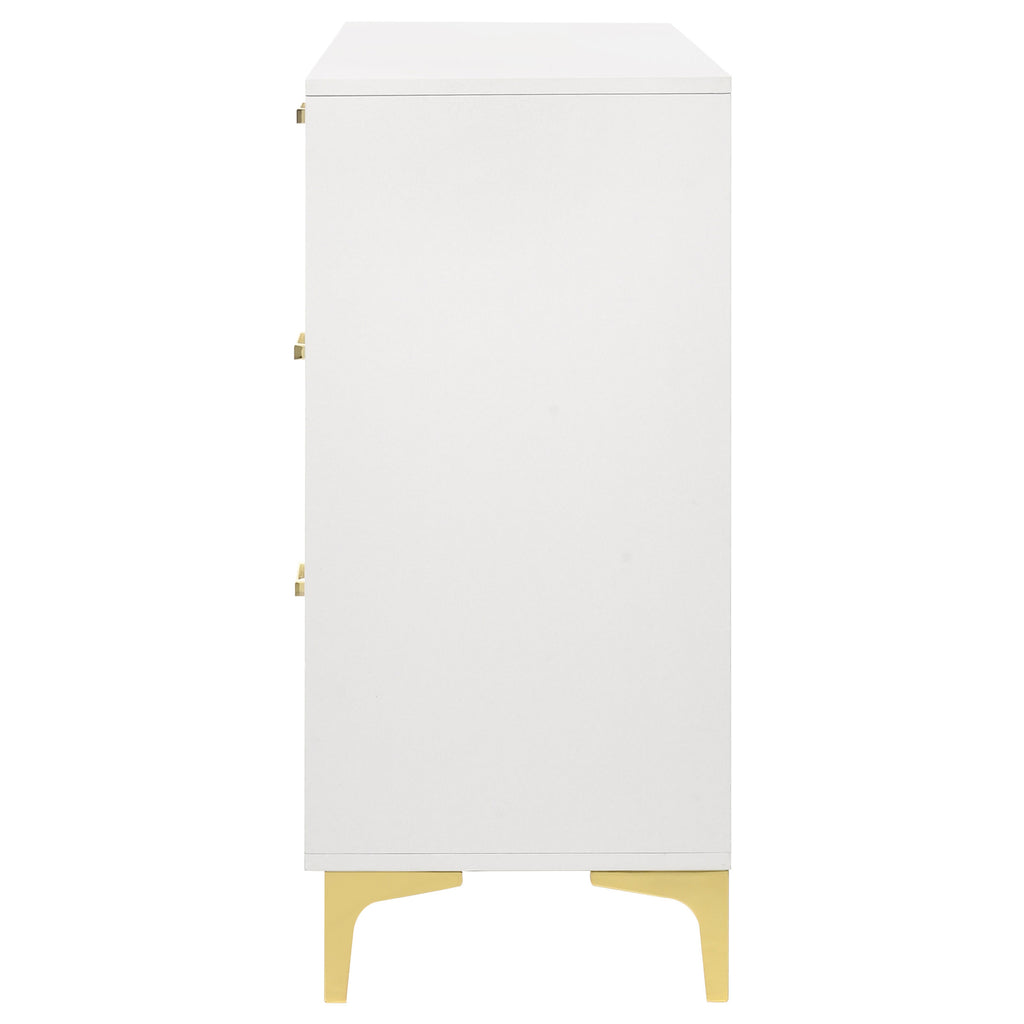Maintain a cheerful and luxe bedroom with this splendid modern glam dresser. A perfect statement piece for contemporary bedrooms, this six-drawer dresser presents a light and airy expression. Accented with gold finished drawer pulls and bracket style legs, a luxe vibe shines through. The crisp, white finish maintains a sleek, dignified presence as well. Long and narrow, this dresser makes a lovely addition to your bedroom's focal wall and grounds a vanity dressing area. Key Features: • Perfect for contemporary and modern bedrooms • Six deep drawers offer all the space you need for garments and accessories • The bright, white finished frame ensures a light and airy disposition • Gold finished pull handles create a luxe flair • Gold bracket style legs carry through the warm metallic accents