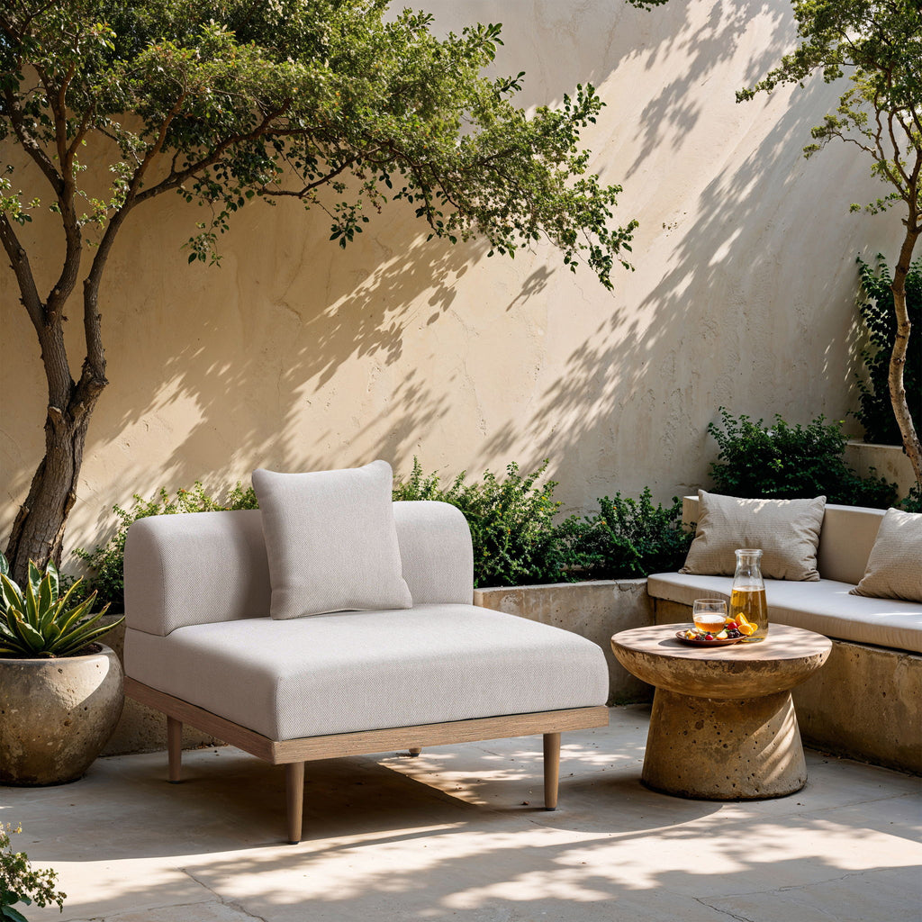 Sleek lines and soft water-resistant fabric bring contemporary style to the Laguna outdoor patio modular armless chair. Crafted with a natural teak finish aluminum frame and quick-dry foam, it's built for ultimate outdoor relaxation. Rearrange or add to the set for endless configurations, creating a versatile lounging experience tailored to your space.