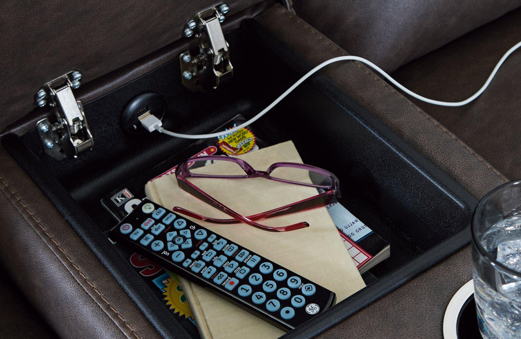 Indulge your lust for comfort and love for contemporary design with this reclining loveseat. Made for easy everyday living, it’s upholstered in a heavyweight padded faux leather and accented with contrast jumbo stitching for fashion-forward flair. Sleek track arms elevate the look with a touch of modern sensibility. A padded center console with dual cup holders completes the experience.