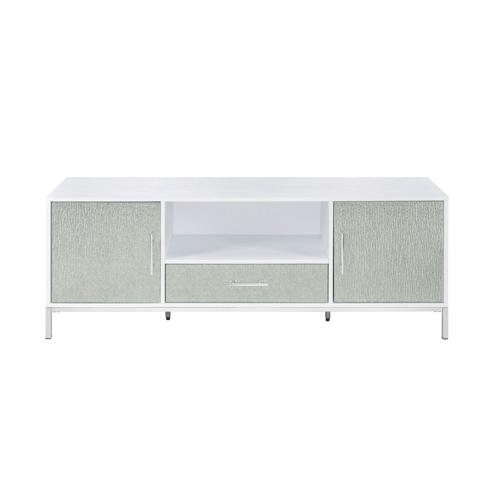 Dazzling and entertaining, the Mirage TV Cabinet makes a beautiful focal point to any room. Glam styling and generous storage combine with a white finish, mirrored drawer fronts and chrome legs in a cabinet that will sparkle with any available light. An open electronic cubby, two doors and a drawer provide ample space for all devices. white incorporated wire management system keeps wires organized.