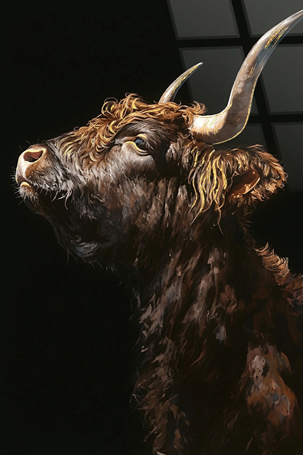 Capture the essence of the wild with this striking portrait of a Highland bull. The detailed photograph on tempered glass brings out the rich textures and earthy tones, making it a captivating centerpiece. Perfect for adding a touch of rustic charm to any room.