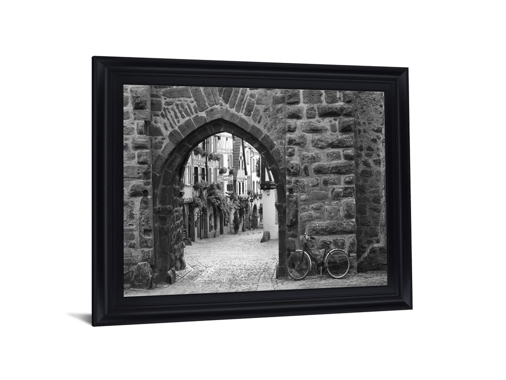 Transport yourself to the enchanting streets of a historic European village with this evocative black-and-white photograph. A vintage bicycle leans quietly against a rugged stone archway, inviting you to imagine the stories of those who have passed through this cobblestone path. The intricate architecture and timeless charm captured in this piece bring a sense of nostalgia and tranquility, perfect for adding depth and character to any living room or office. Encased in a sleek midnight aura frame, this ready-to-hang artwork combines classic elegance with contemporary style, making it a captivating focal point in your space.
