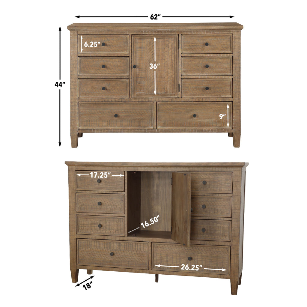 Transform your bedroom into a cozy and inviting space with the Riverdale Dresser, a perfect blend of rustic sophistication and modern styling. Crafted from solid pine and Asian hardwood solids, this dresser features wood scoring and saw rasping to relax the appearance like a time-worn antique. With spacious drawers and a door, there's plenty of storage for clothing and bulky items, and two felt-lined drawers ensure your delicates stay protected. The Riverdale Dresser is the perfect addition to any bedroom that craves both character and functionality.