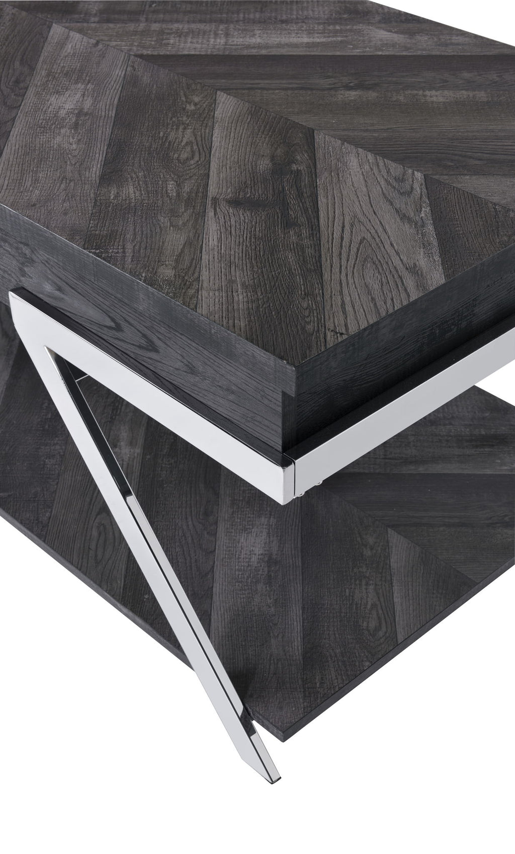 Contemporary style in a shadow grey finish, Roma offers aesthetic and practicality in one package. The mixed media Roma 3pc Occasional Set blends chrome and rustic engineered woods for a handsome, yet functional piece. The Lift-Top Cocktail table features under top storage for devices or remotes and the bottom shelf can be used for display or storage. Matching end tables also feature bottom shelf. Your purchase includes one lift-top cocktail table and two end tables.