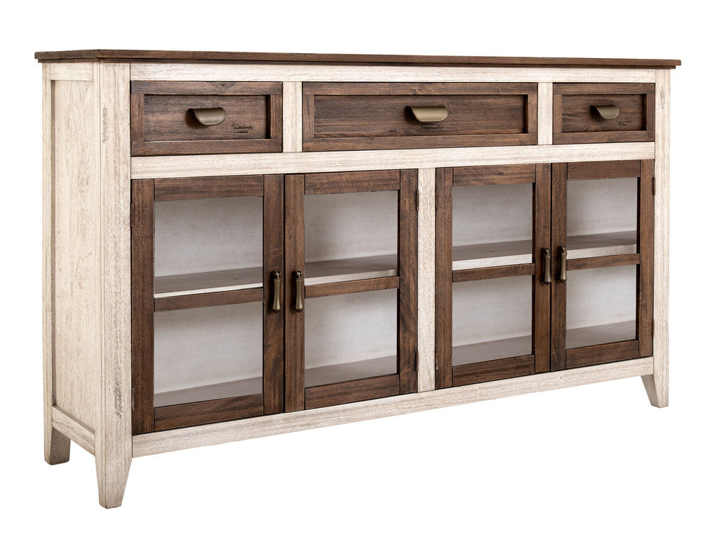 3 Drawer 4 Glass Door Console. Introducing Sahara, an organic modern collection designed to transform your space into a tranquil and neutral haven. Crafted from sustainably sourced, lightly distressed mango wood, this stunning minimalistic collection effortlessly blends style and sustainability, making it a perfect fit for any space.