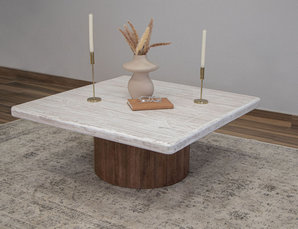Square Cocktail Table. Introducing Sahara, an organic modern collection designed to transform your space into a tranquil and neutral haven. Crafted from sustainably sourced, lightly distressed mango wood, this stunning minimalistic collection effortlessly blends style and sustainability, making it a perfect fit for any space.